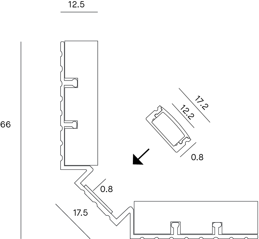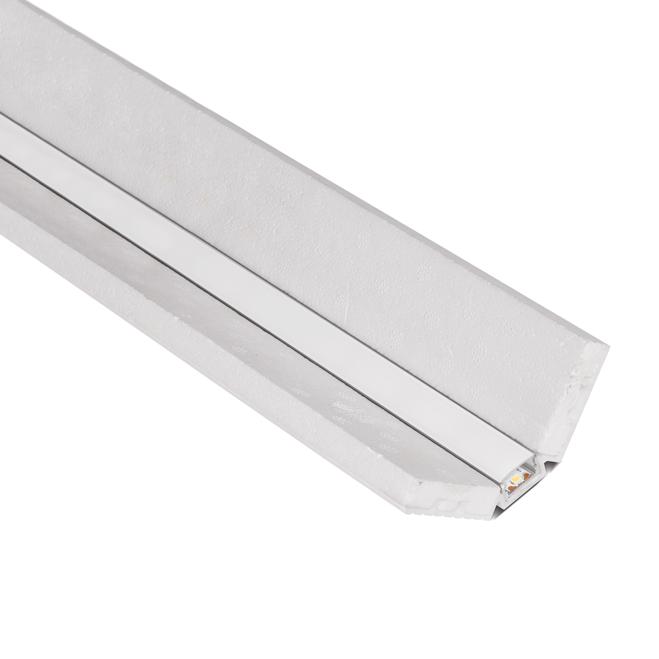 Controcassa in polistirene e PVC da 1000mm, per installazione a incasso in cartongesso di spessore 12,5mm. Ideale per la realizzazione di tagli di luce verticali e/o orizzontali ad angolo interno su cartongesso. Il codice prodotto include: 2 pz da 1000mm di struttura, 2pz da 1000mm di profilo in alluminio per striscia LED con diffusore in PC opale e 2pz da 1000mm di guaina in neoprene a protezione del profilo in alluminio durante la rasatura. Fissaggio alla struttura tramite viti per cartongesso (non incluse). Idoneo per ambienti umidi (utilizzando strip outdoor compatibili).