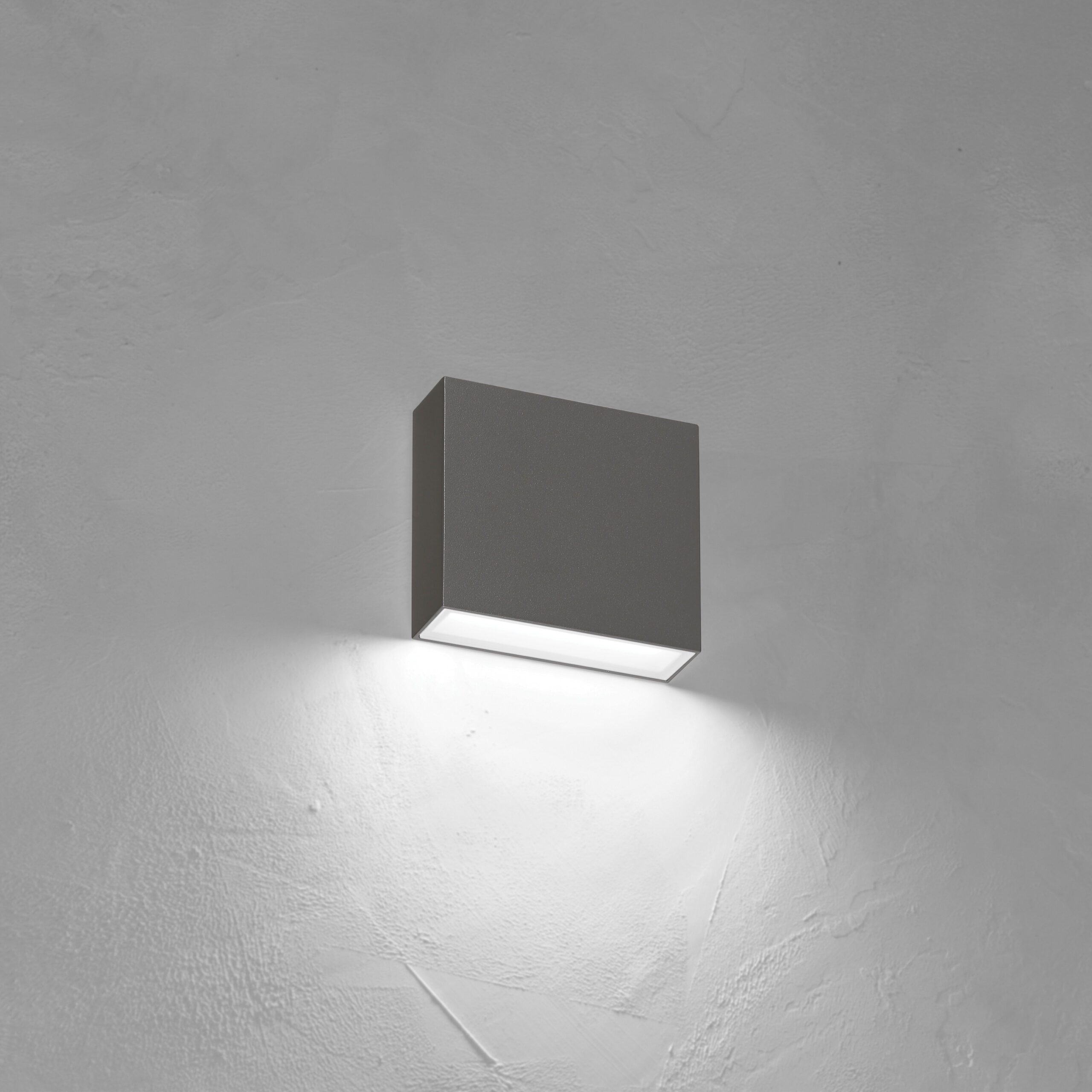 Applique LED mono e bi-emissione rettangolare IP67 per installazione a parete. LED HONGLI. Lifetime 50.000h (rendimento 70%). Corpo in pressofusione di alluminio verniciato bianco, antracite, grigio o marrone scuro. Diffusore in vetro opale. Alimentatore integrato.