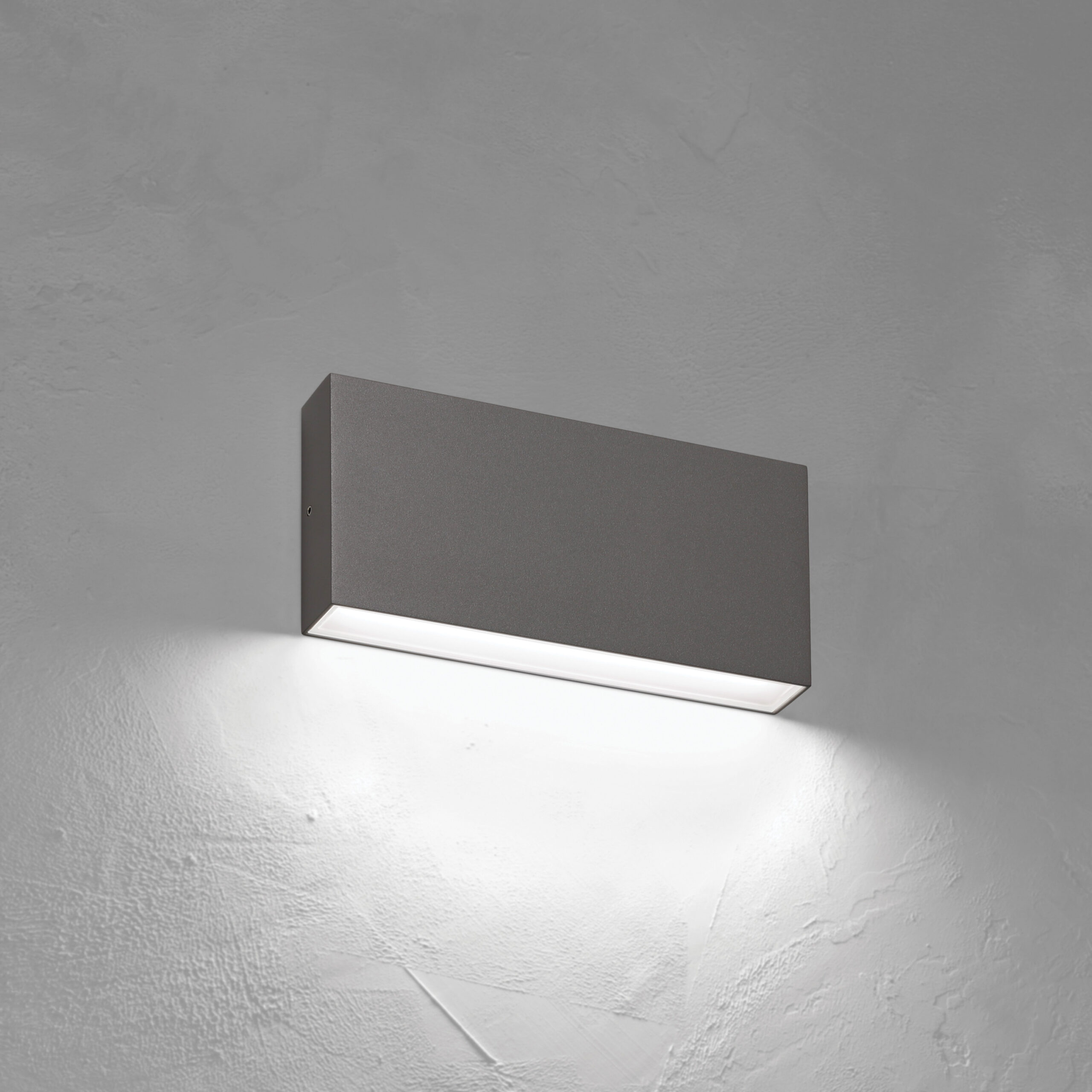 Applique LED mono-emissione rettangolare IP67 per installazione a parete. LED CREE. Lifetime 50.000h (rendimento 70%). Corpo in pressofusione di alluminio verniciato bianco, antracite, grigio o marrone scuro. Diffusore in vetro serigrafato nero. Lenti in PMMA. Versione diffusa: LED HONGLI, diffusore in vetro opale.