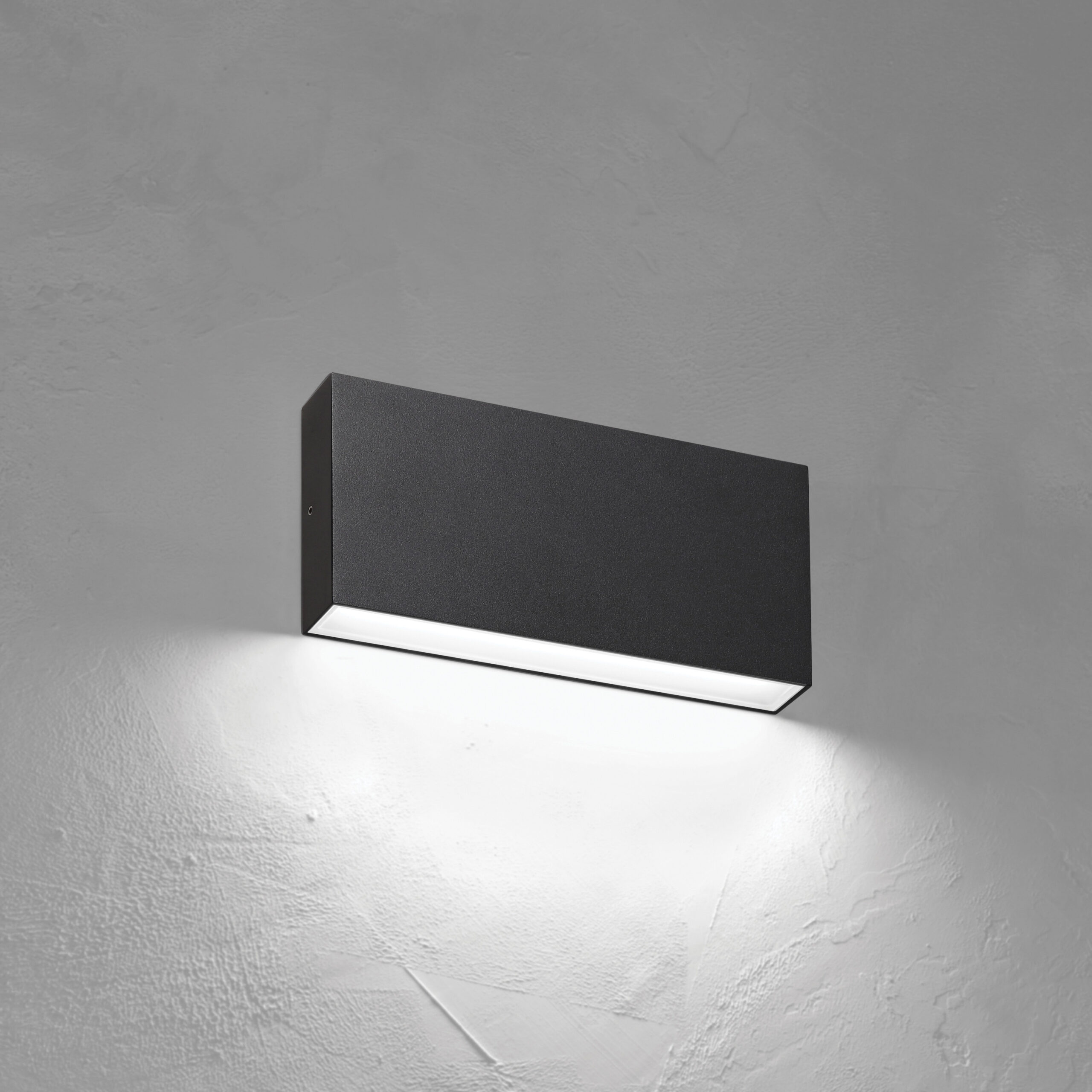 Applique LED mono-emissione rettangolare IP67 per installazione a parete. LED CREE. Lifetime 50.000h (rendimento 70%). Corpo in pressofusione di alluminio verniciato bianco, antracite, grigio o marrone scuro. Diffusore in vetro serigrafato nero. Lenti in PMMA. Versione diffusa: LED HONGLI, diffusore in vetro opale.