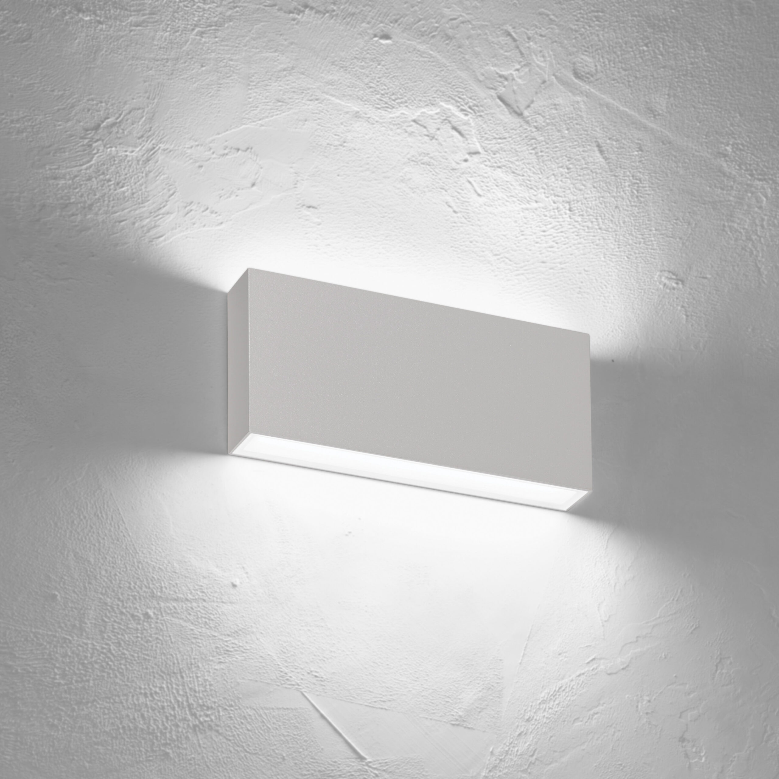 Applique LED bi-emissione rettangolare IP67 per installazione a parete. LED CREE. Lifetime 50.000h (rendimento 70%). Corpo in pressofusione di alluminio verniciato bianco, antracite, grigio o marrone scuro. Diffusore in vetro serigrafato nero. Lenti in PMMA. Versione diffusa: LED HONGLI, diffusore in vetro opale.