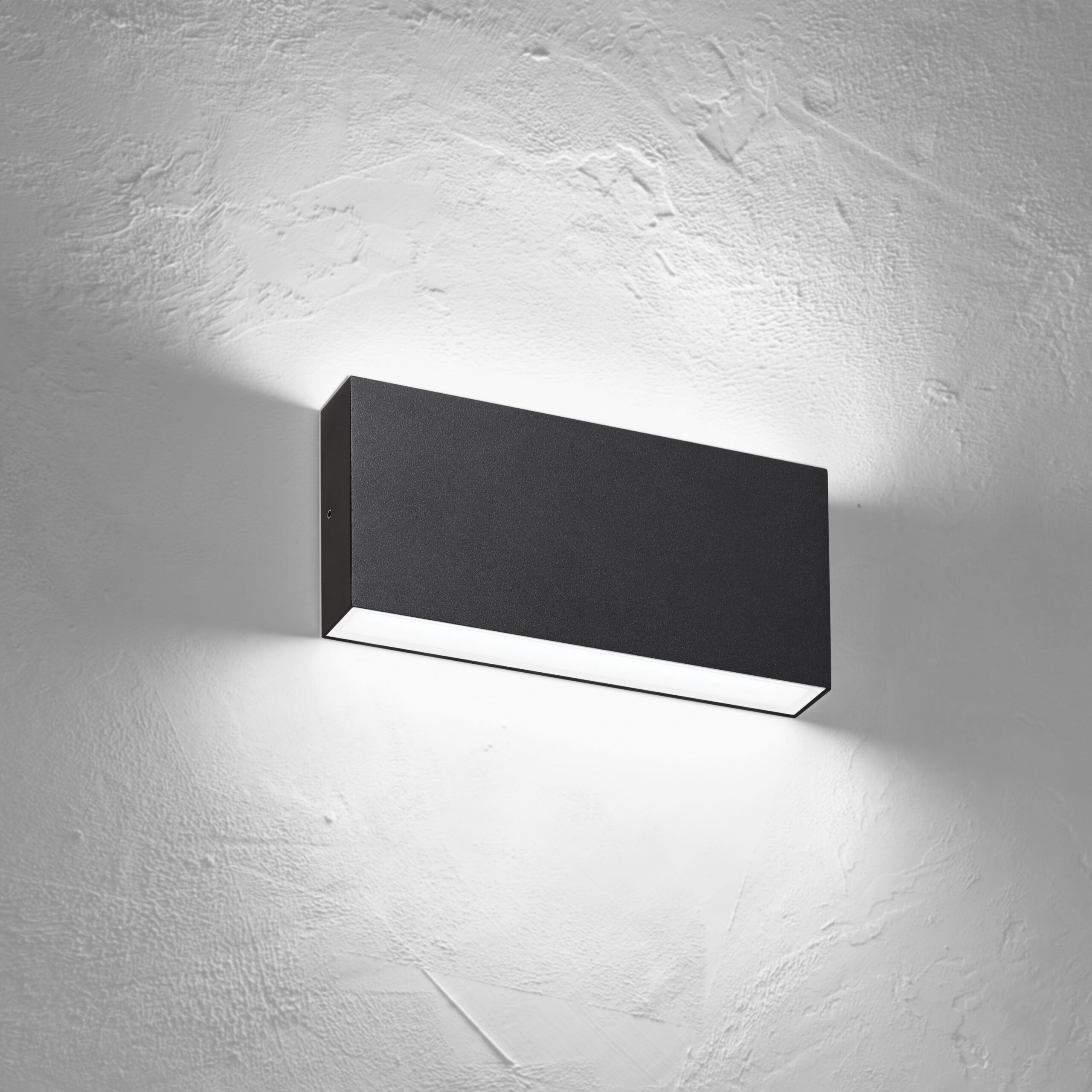 Applique LED bi-emissione rettangolare IP67 per installazione a parete. LED CREE. Lifetime 50.000h (rendimento 70%). Corpo in pressofusione di alluminio verniciato bianco, antracite, grigio o marrone scuro. Diffusore in vetro serigrafato nero. Lenti in PMMA. Versione diffusa: LED HONGLI, diffusore in vetro opale.