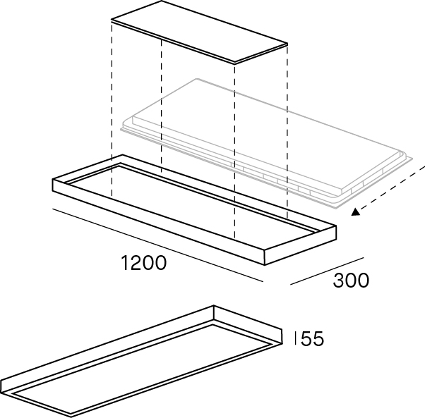 Carter: struttura in acciaio verniciato bianco goffrato per installazione a plafone. E’ possibile la sospensione del carter con