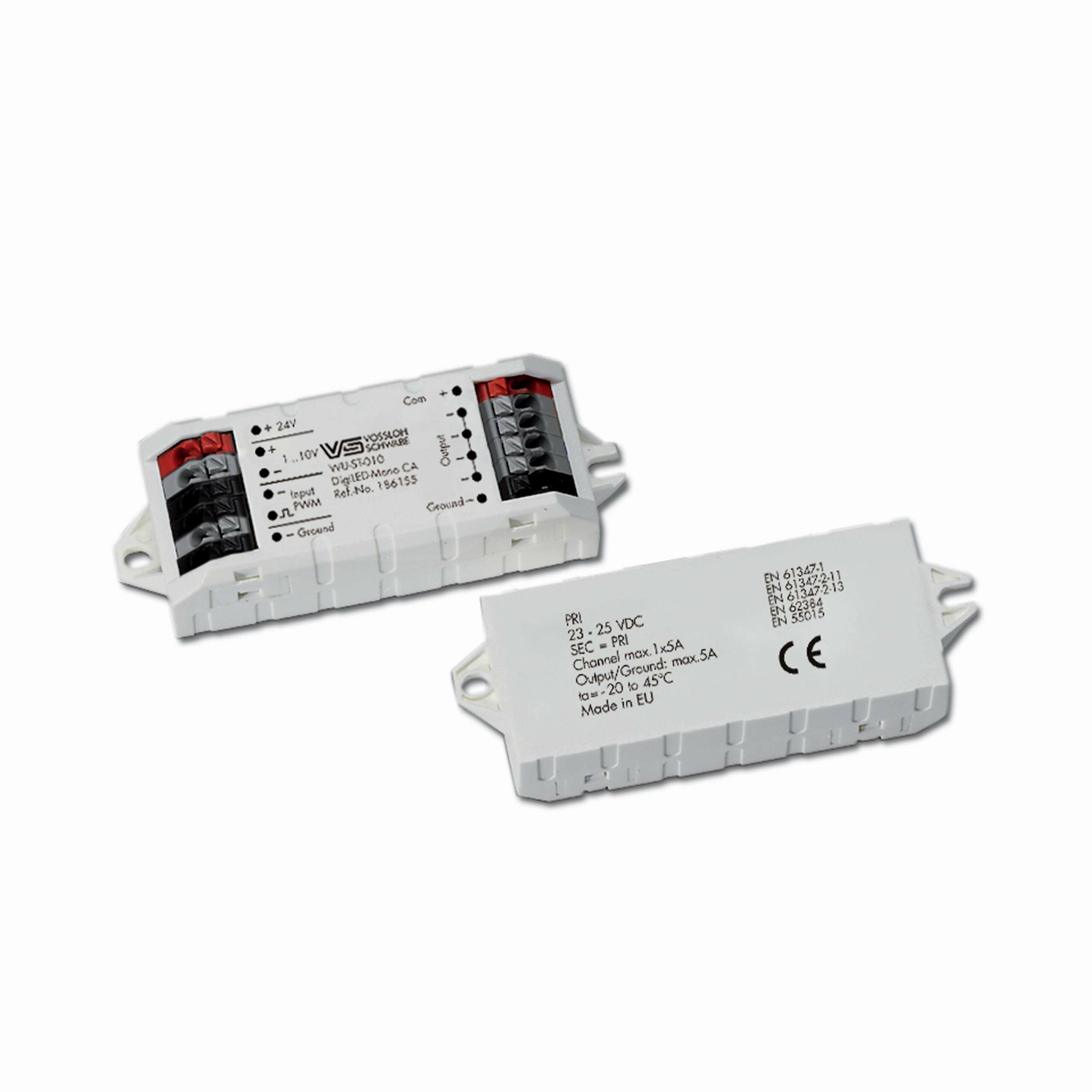Dimmer per la regolazione di moduli LED monocolore a 24V. Regolazione tramite interfaccia 1-10V. Corrente max. per ogni canale: 5A (max 120W sui tre