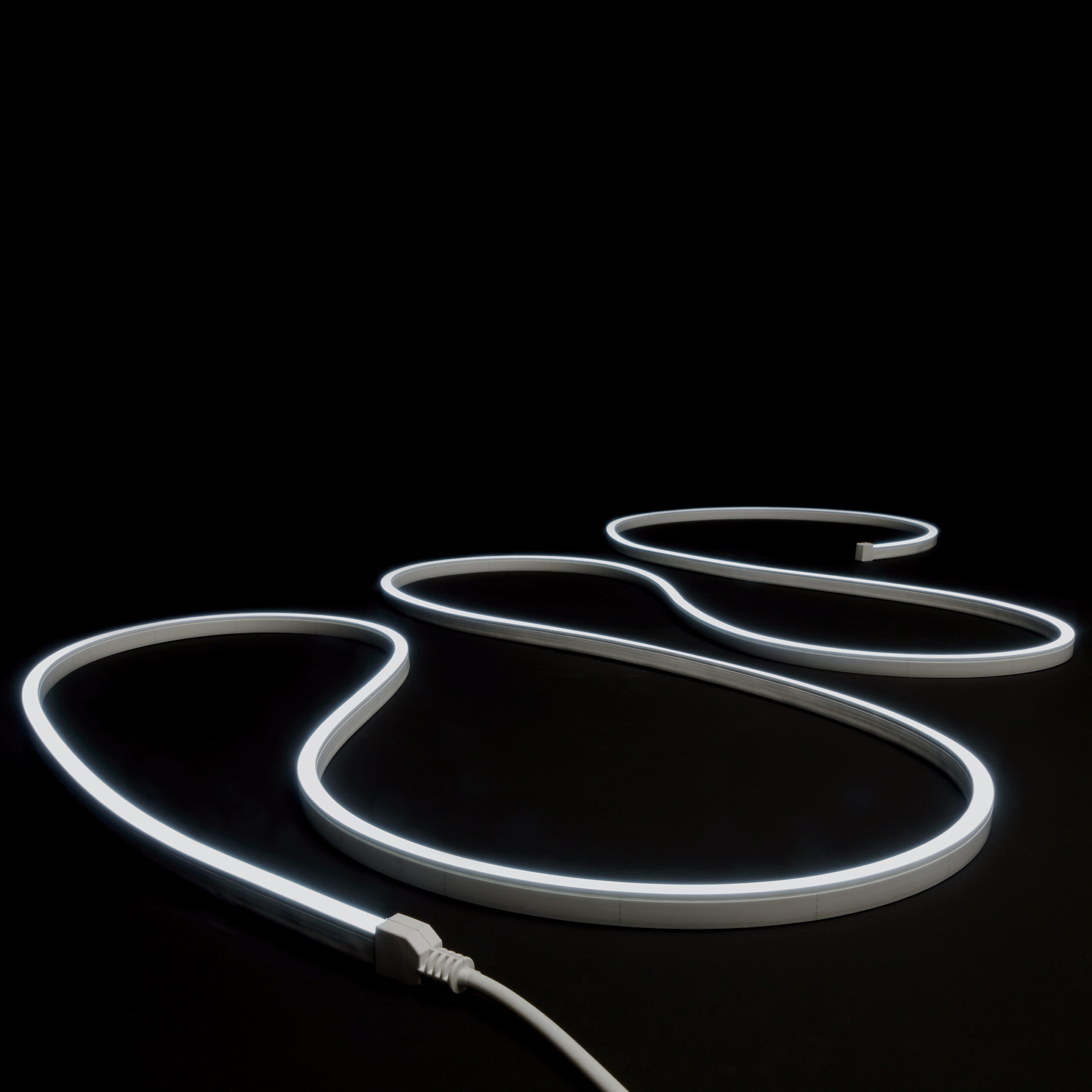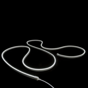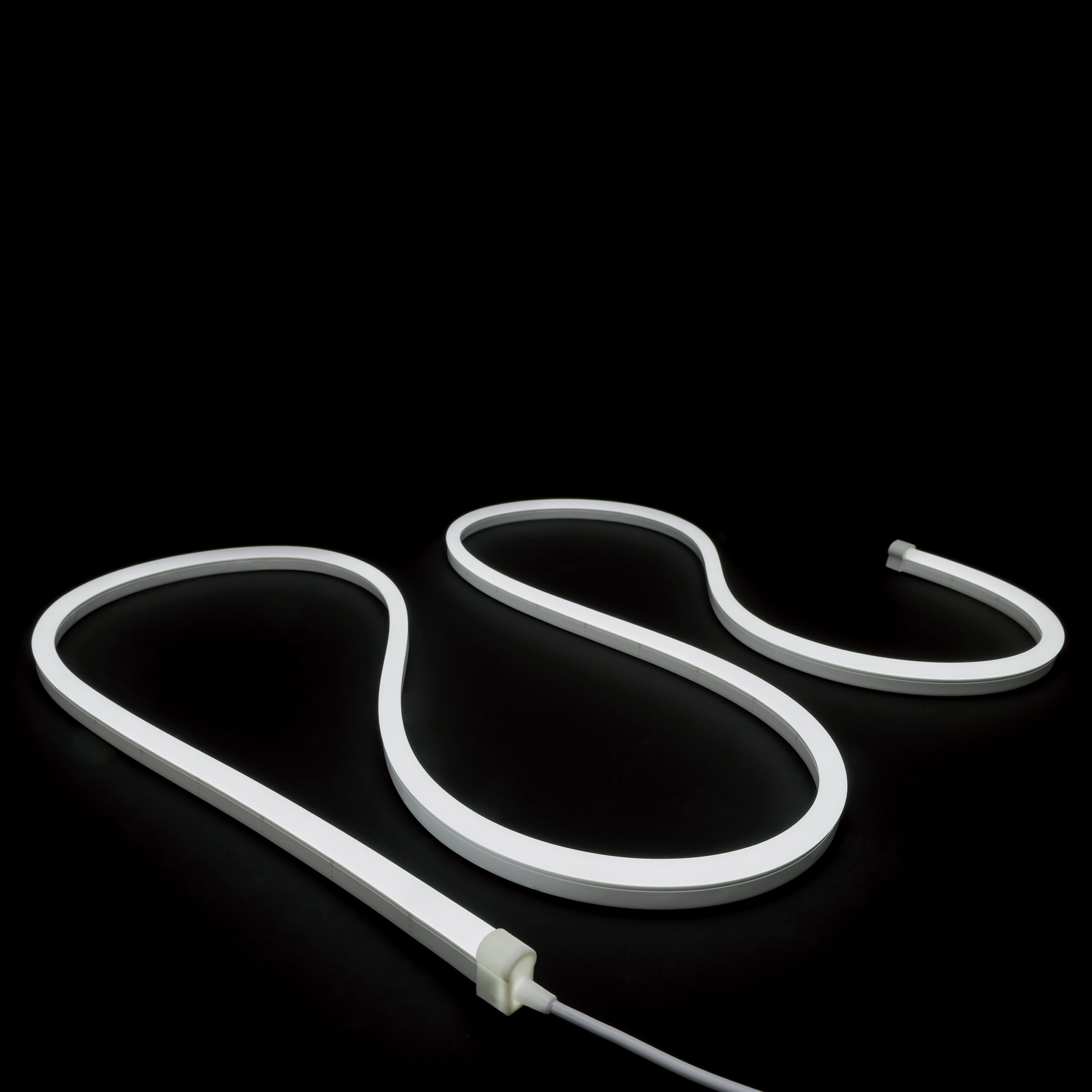 Linea luminosa LED flessibile IP67, che permette linee dritte o curve senza interruzioni di luce. LED monocromatici montati su circuito flessibile incapsulato in silicone bianco (lato esterno) e opalescente (lato LED). Lunghezza 5m, lunghezza massima alimentabile per singola bobina: 5m. Installazione a superficie con clips o su profilo in alluminio da ordinare separatamente. Alimentatore e unità di controllo non inclusi.