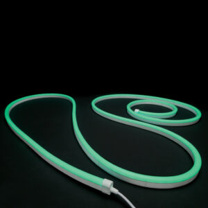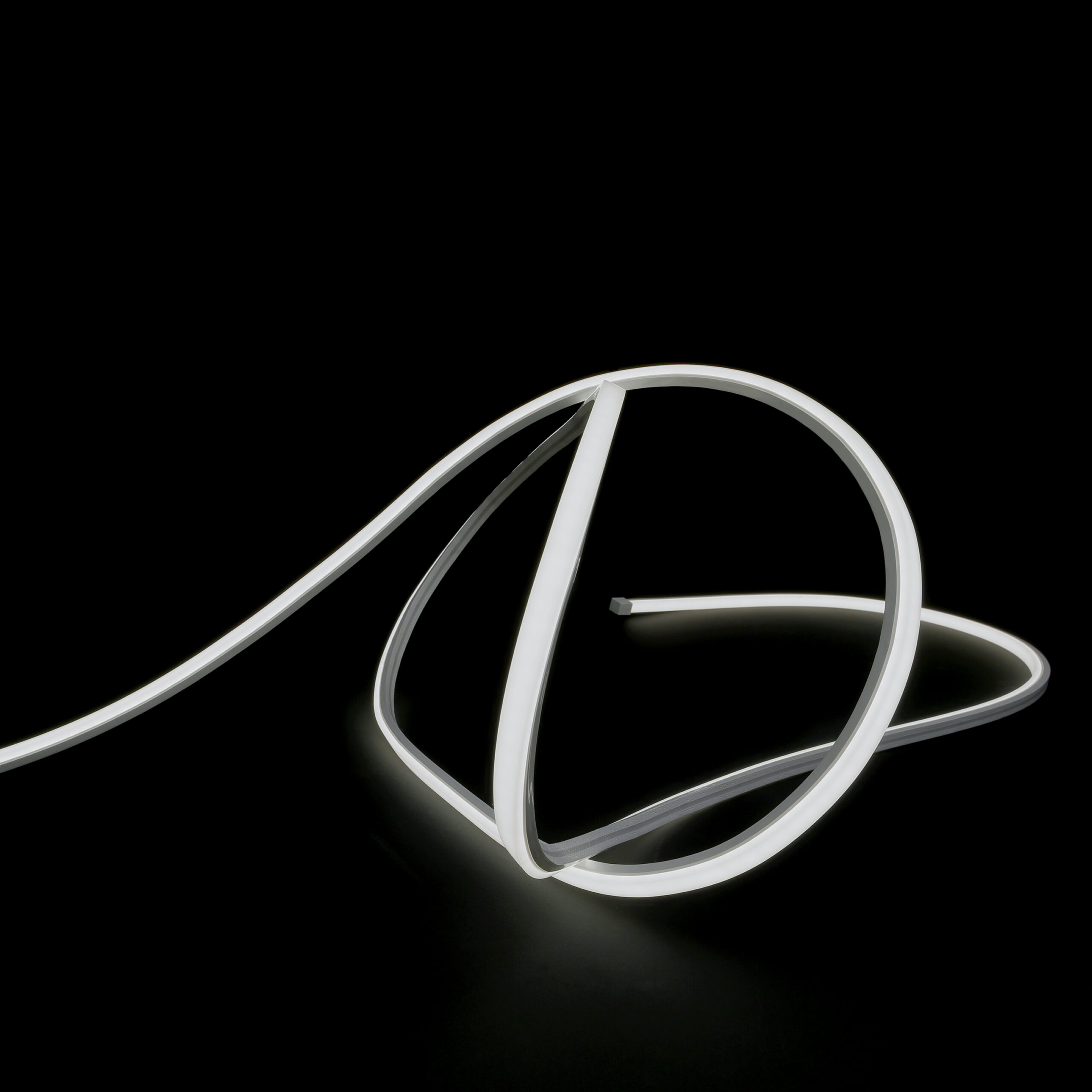 Linea luminosa LED flessibile, che permette linee dritte o curve senza interruzioni di luce. LED monocromatici montati su circuito flessibile incapsulato in silicone bianco (lato esterno) e opalescente (lato LED). Lunghezza 5m, lunghezza massima alimentabile per singola bobina: 5m. Installazione a superficie con clips o su profilo in alluminio da ordinare separatamente. Alimentatore e unità di controllo non inclusi.