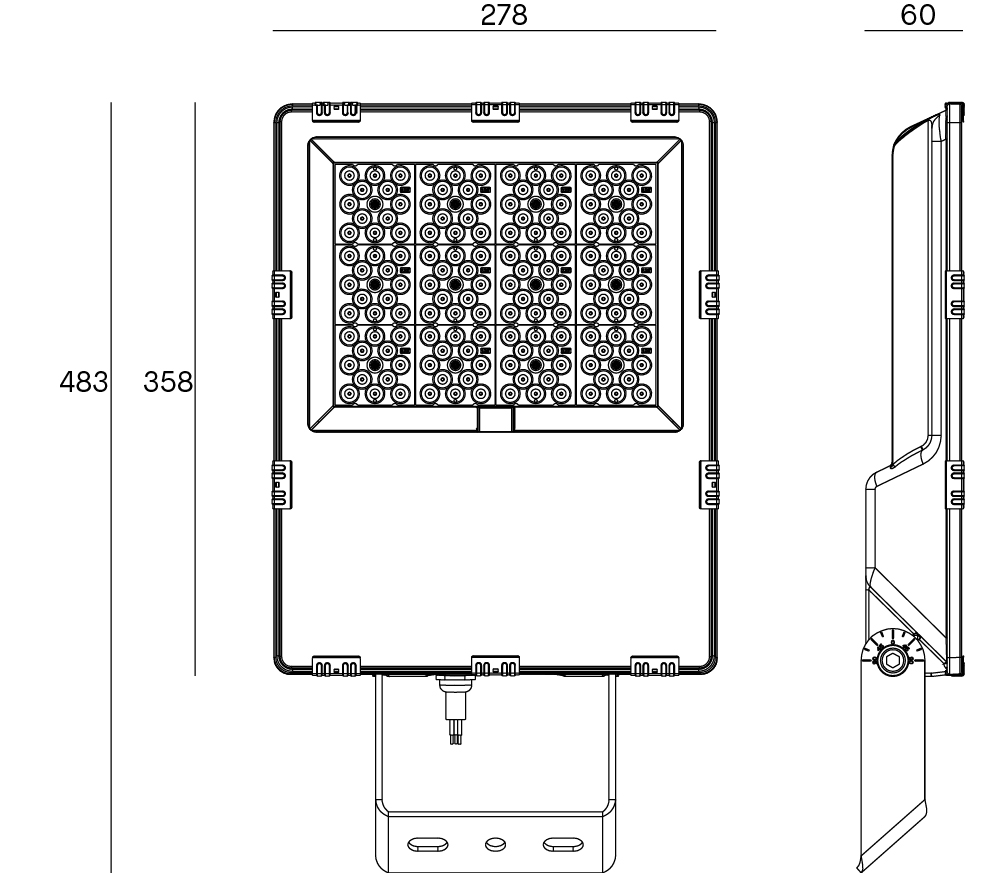 Proiettore industriale LED per installazione a superficie con staffa in acciaio inclusa. Corpo in alluminio pressofuso verniciato a polveri nero opaco. Ottica in PC, emissione simmetrica 120° o asimmetrica 100°x150°. Vetro temperato trasparente. Cavo in neoprene H05RN-F 3x1mm² da 1m. Alimentatore incluso.