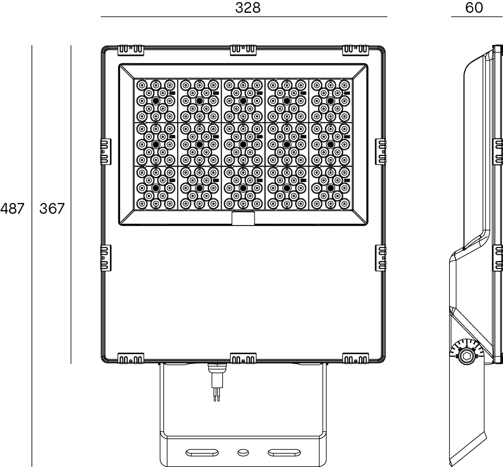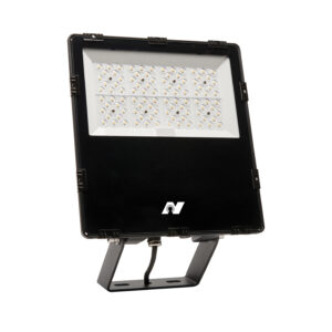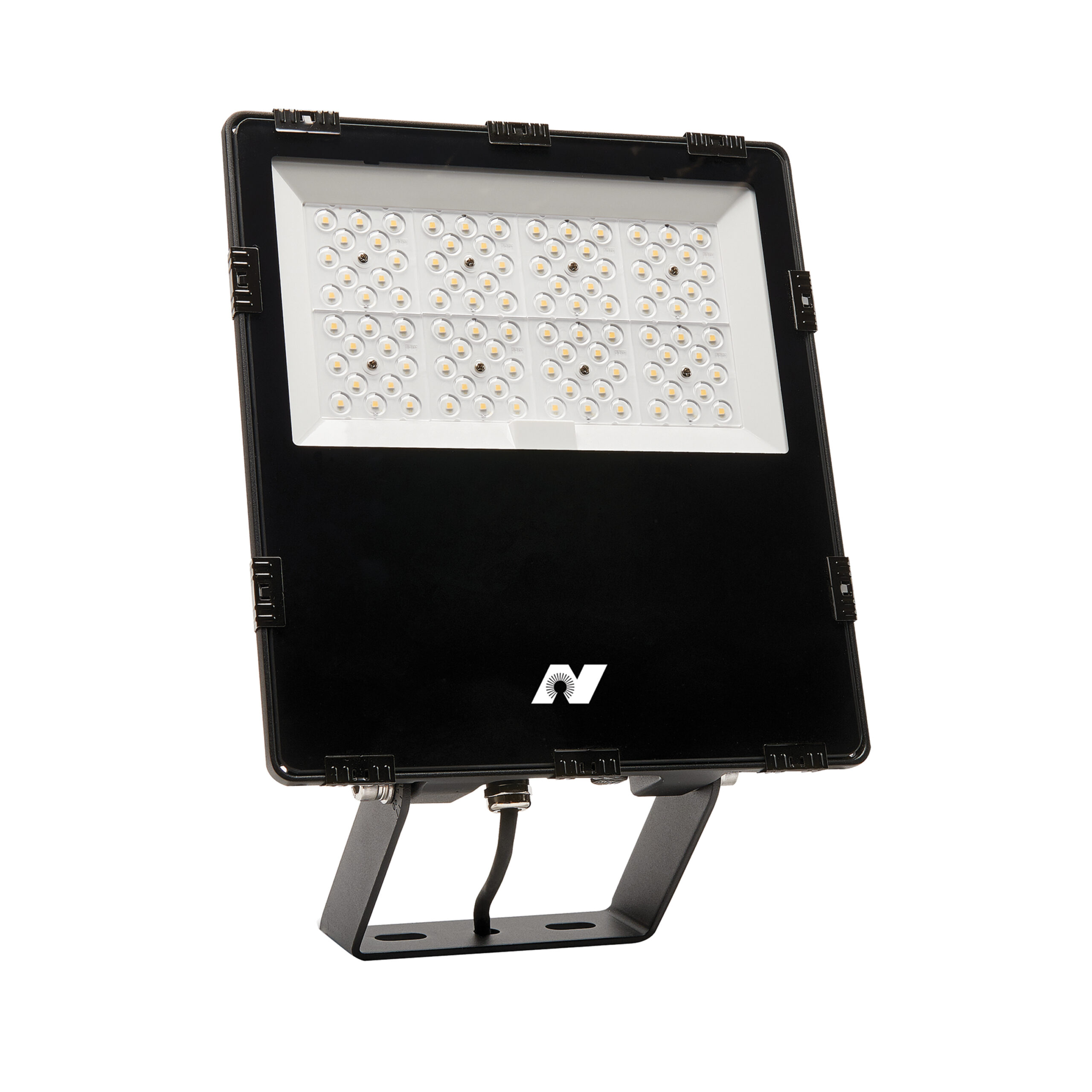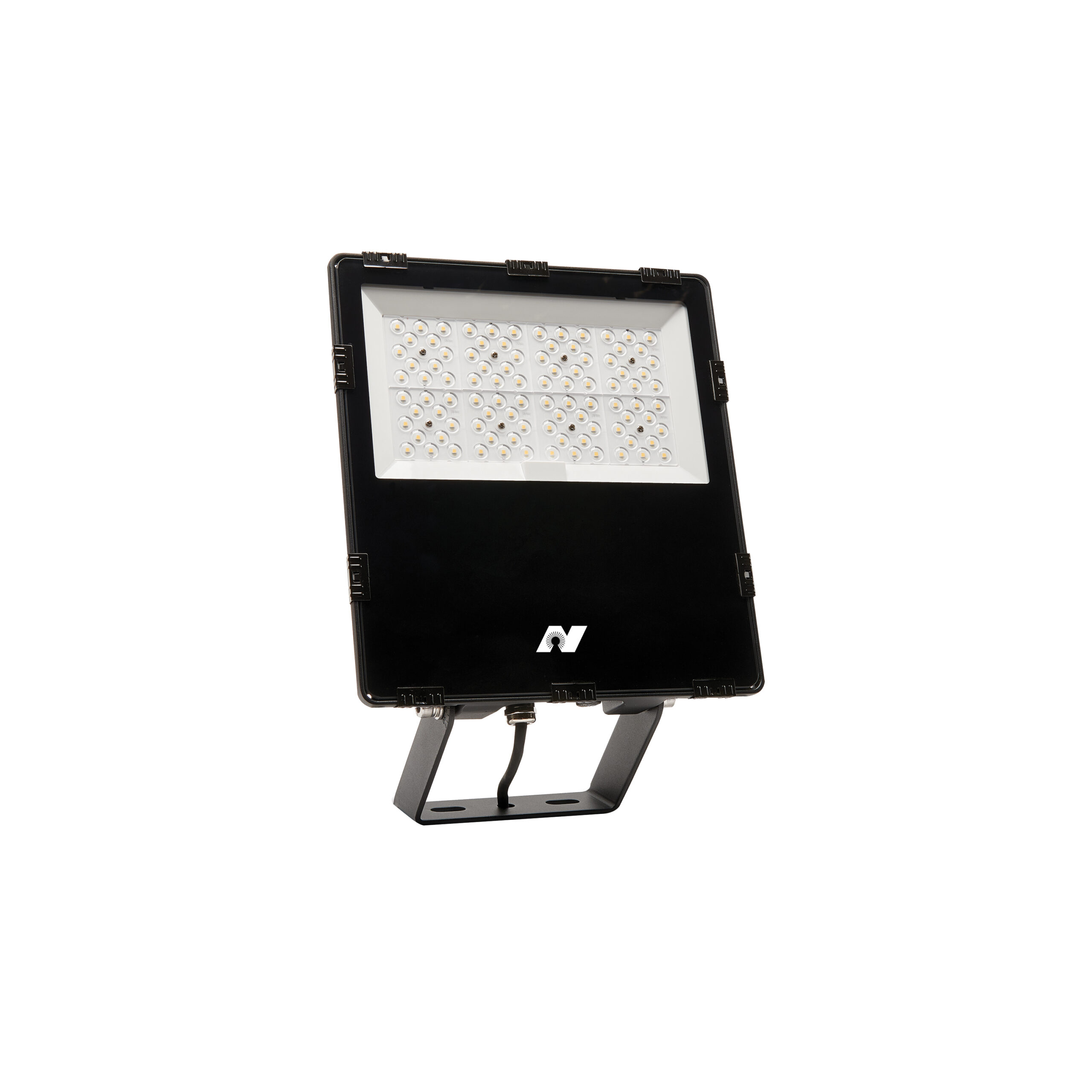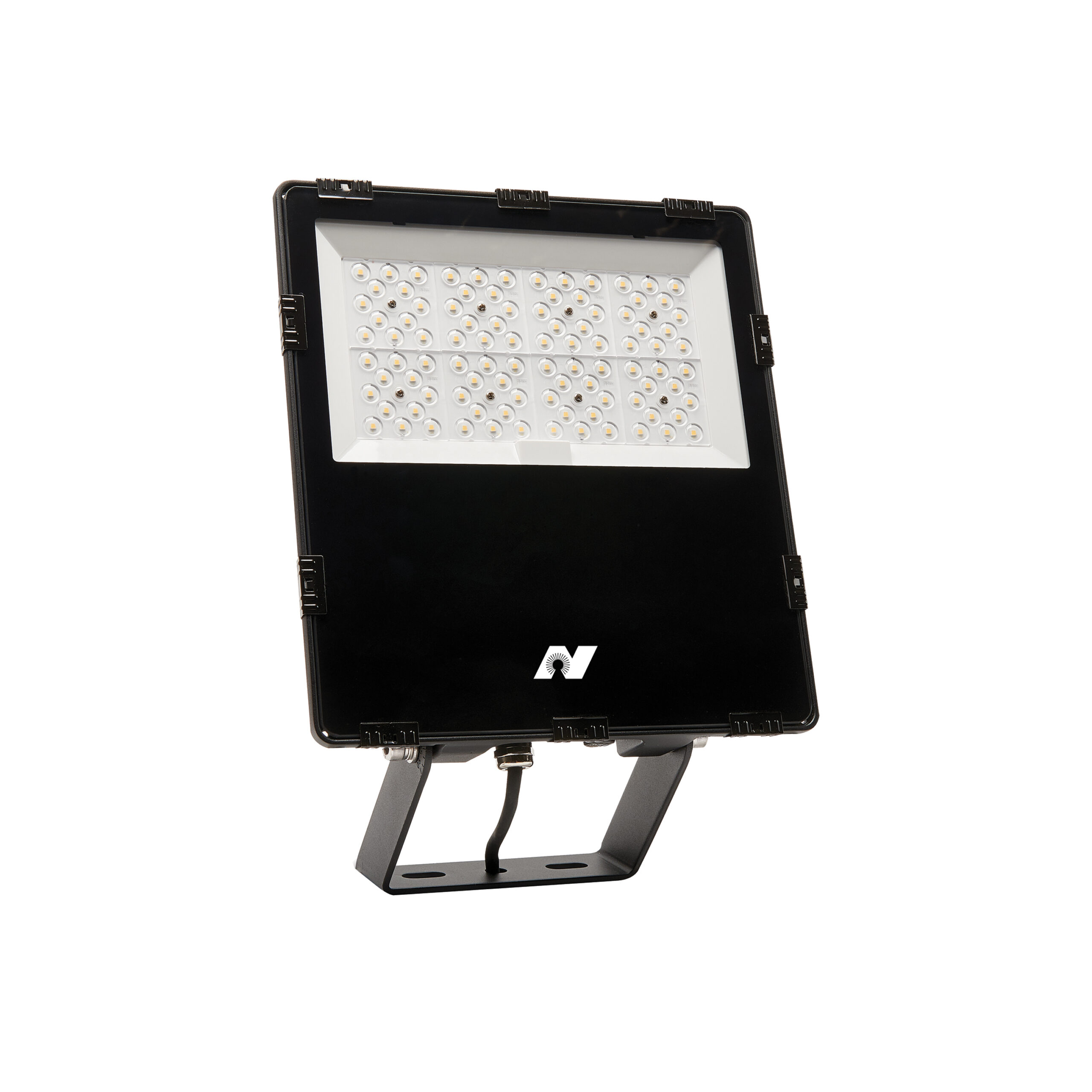 Proiettore industriale LED per installazione a superficie con staffa in acciaio inclusa. Corpo in alluminio pressofuso verniciato a polveri nero opaco. Ottica in PC, emissione simmetrica 120° o asimmetrica 100°x150°. Vetro temperato trasparente. Cavo in neoprene H05RN-F 3x1mm² da 1m. Alimentatore incluso.