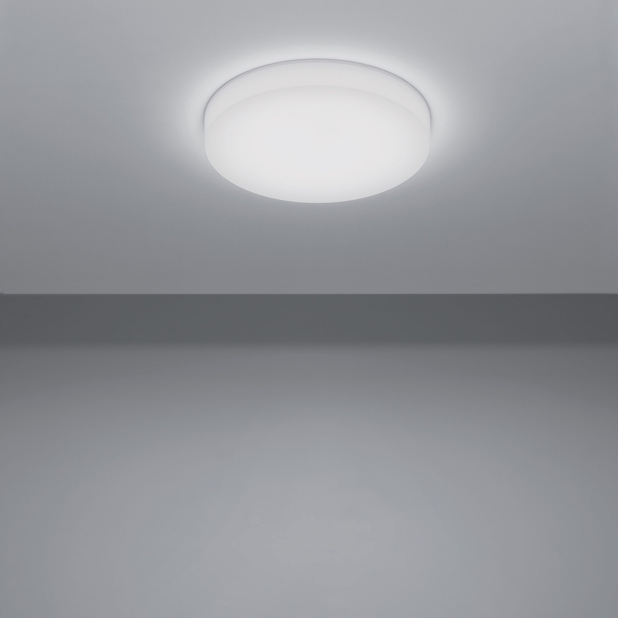 Plafoniera LED tonda IP65 per installazione a parete o a plafone. LED 2835. Lifetime 30.000h (rendimento 70%). Corpo in policarbonato bianco e diffusore opale.