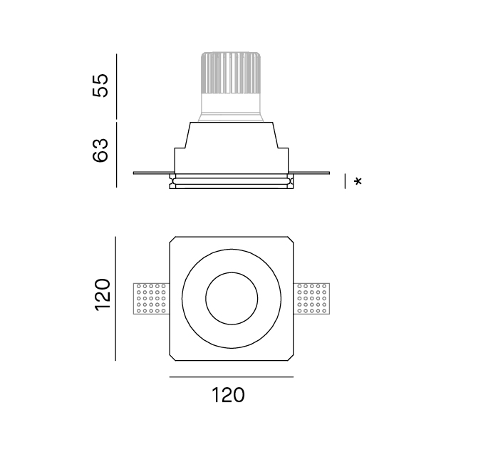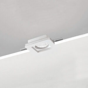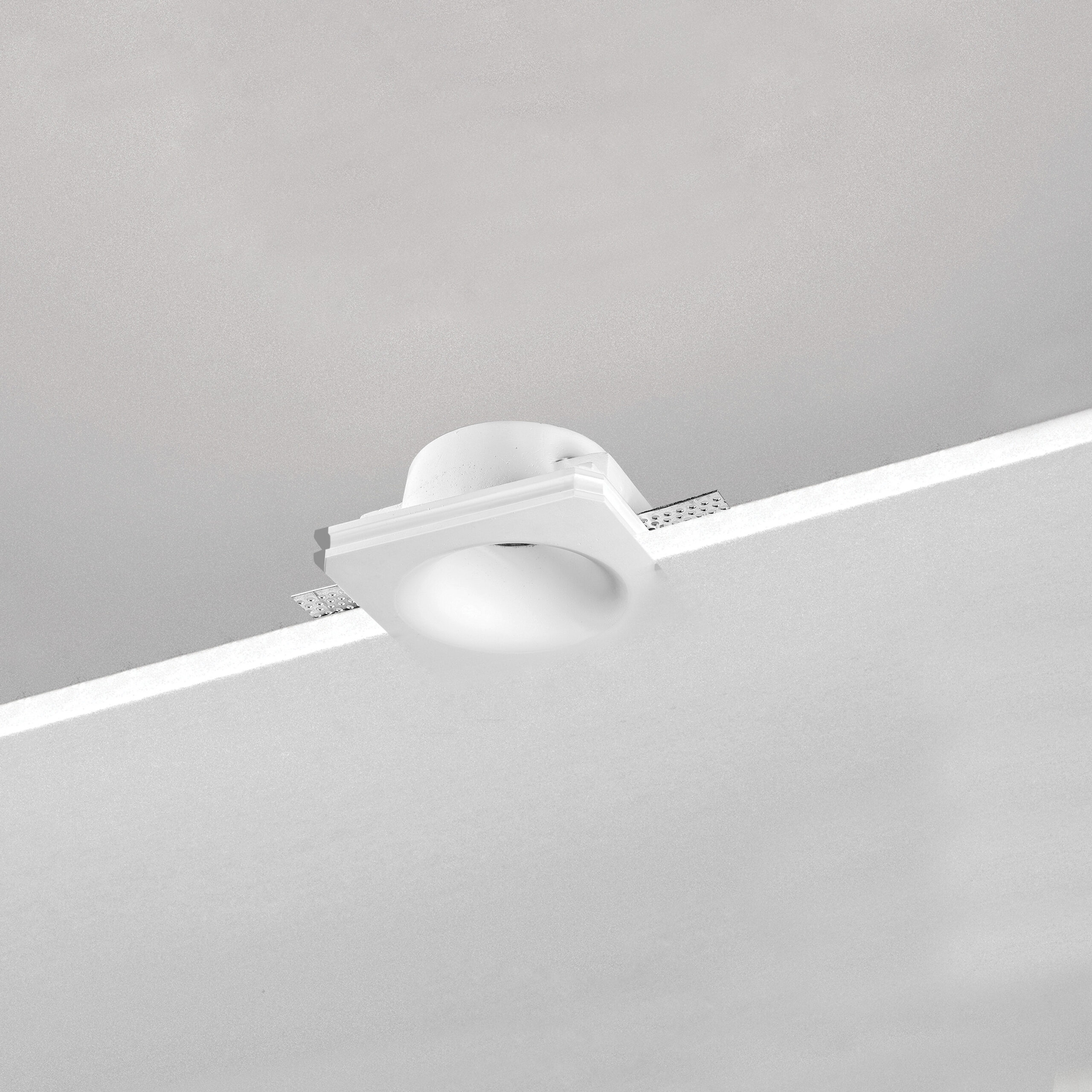 Cornice quadrata in gesso, completa di alette per il fissaggio al cartongesso, con dimensioni variabili da 6 a 15mm di spessore. Emissione fissa. Incasso a scomparsa totale. IP20. Completo di portalampada GU10, compatibile con lampada LED max 8W, non inclusa. Dimensioni: 120x120mm, altezza 63mm. Modulo LED IP64
