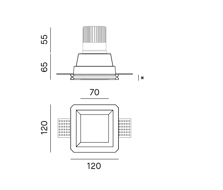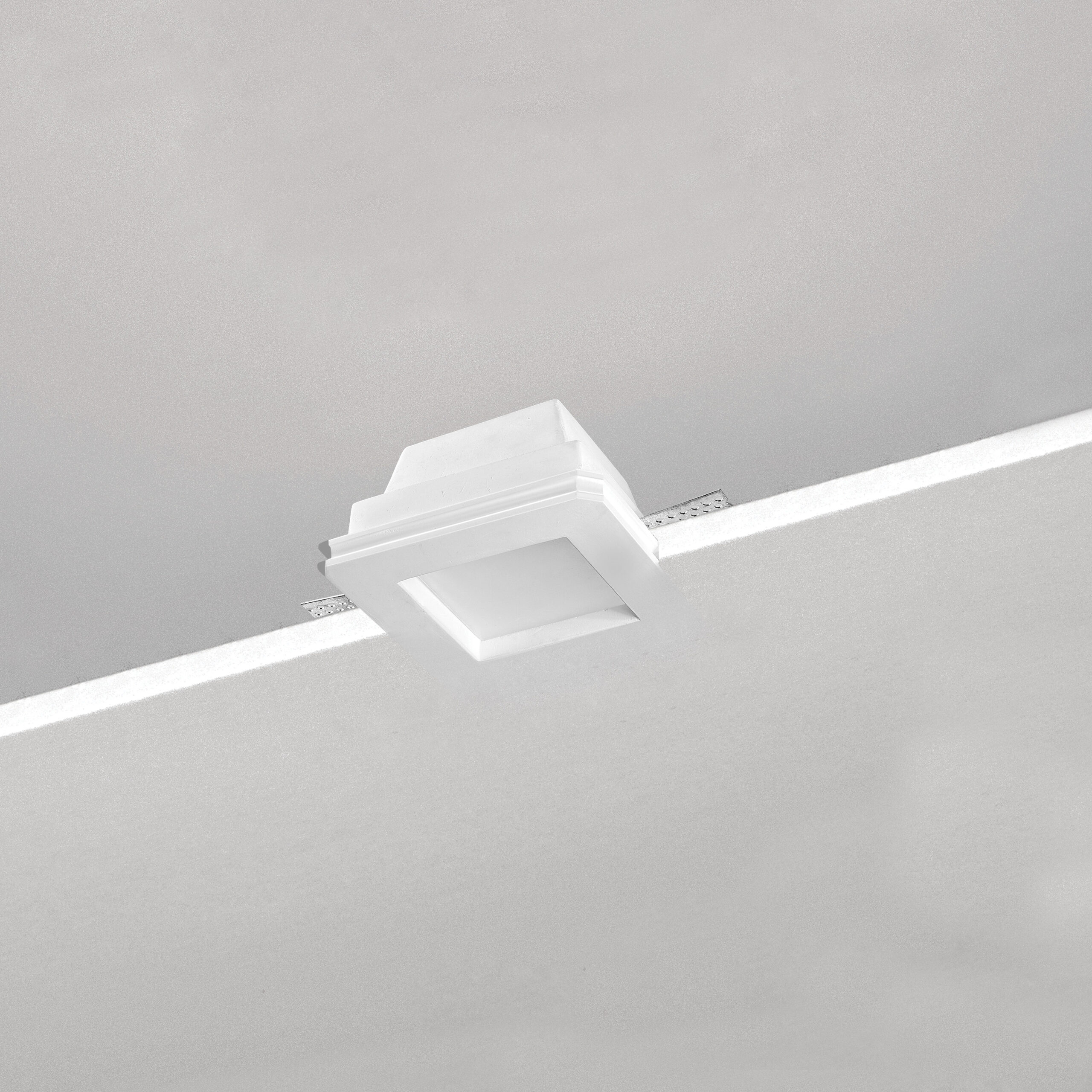 Cornice quadrata in gesso, completa di alette per il fissaggio al cartongesso, con dimensioni variabili da 6 a 15mm di spessore. Emissione fissa. Incasso a scomparsa totale. Vetro acidato. IP20. Completo di portalampada GU10, compatibile con lampada LED max 8W, non inclusa. Dimensioni: 120x120mm, altezza 65mm.