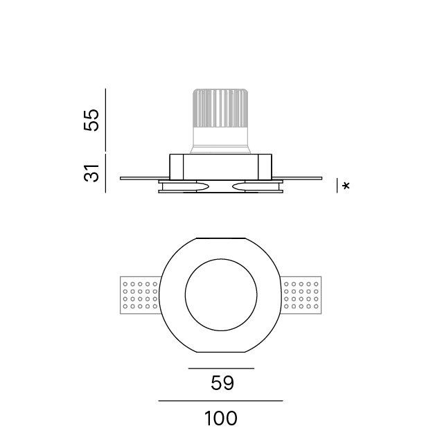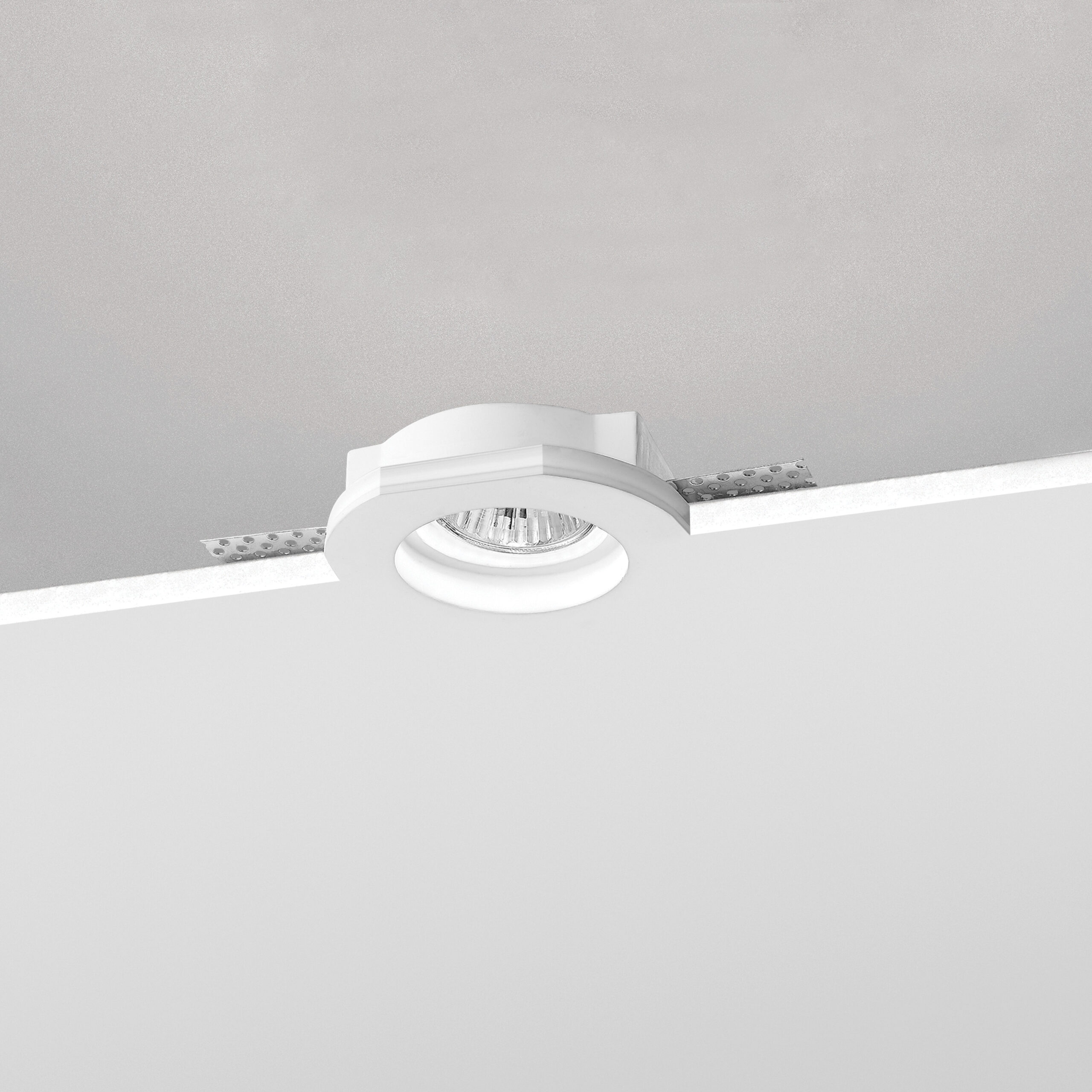 Cornice tonda in gesso, completa di alette per il fissaggio al cartongesso, con dimensioni variabili da 6 a 15mm di spessore. Emissione fissa. Incasso a scomparsa totale. IP20. Completo di portalampada GU10, compatibile con lampada LED max 8W, non inclusa. Dimensioni: diametro 100mm, altezza 31mm. Modulo LED IP64