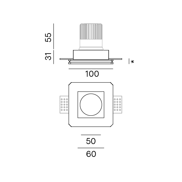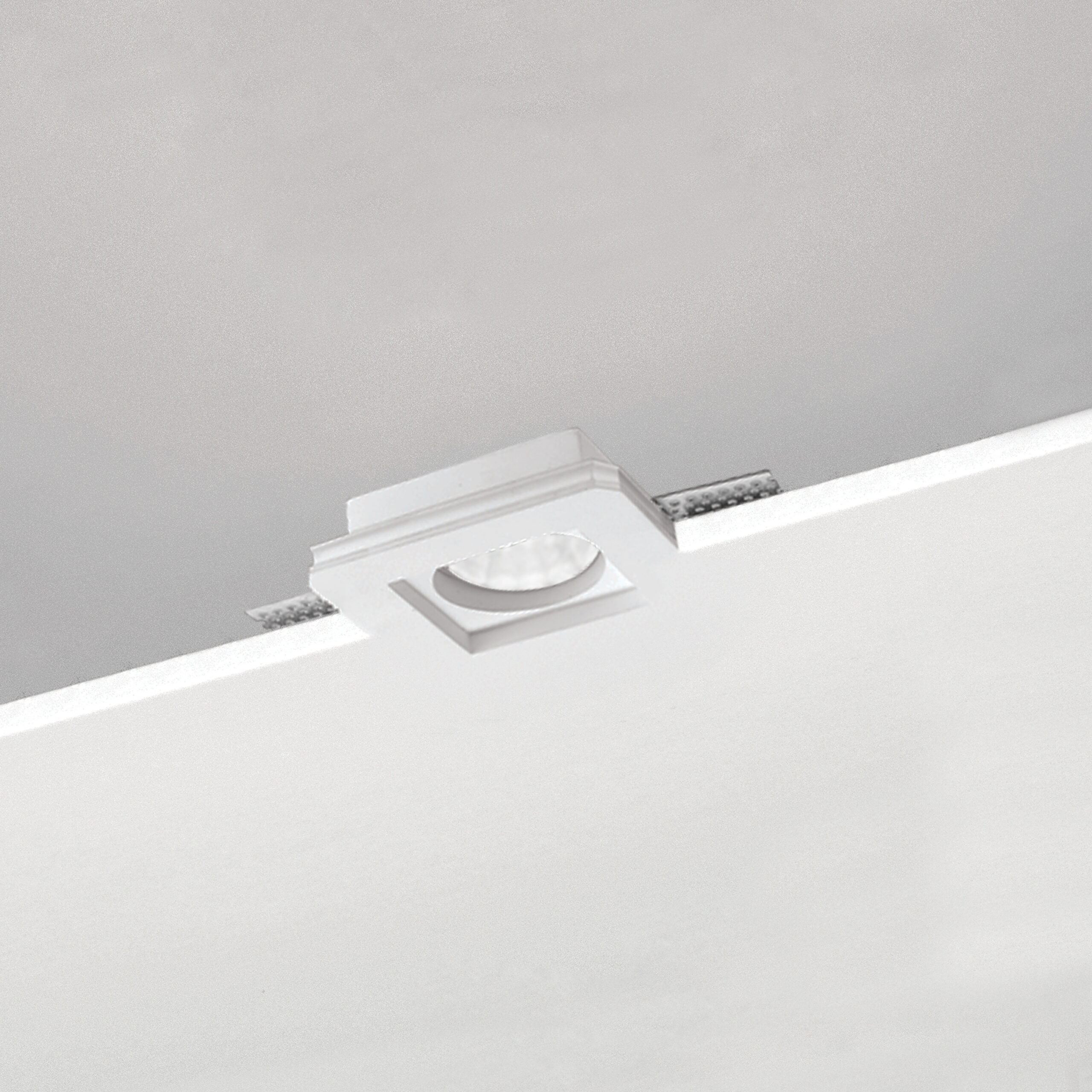 Cornice quadrata in gesso, completa di alette per il fissaggio al cartongesso, con dimensioni variabili da 6 a 15mm di spessore. Emissione fissa. Incasso a scomparsa totale. IP20. Completo di portalampada GU10, compatibile con lampada LED max 8W, non inclusa. Dimensioni: 100x100mm, altezza 31mm. Modulo LED IP64