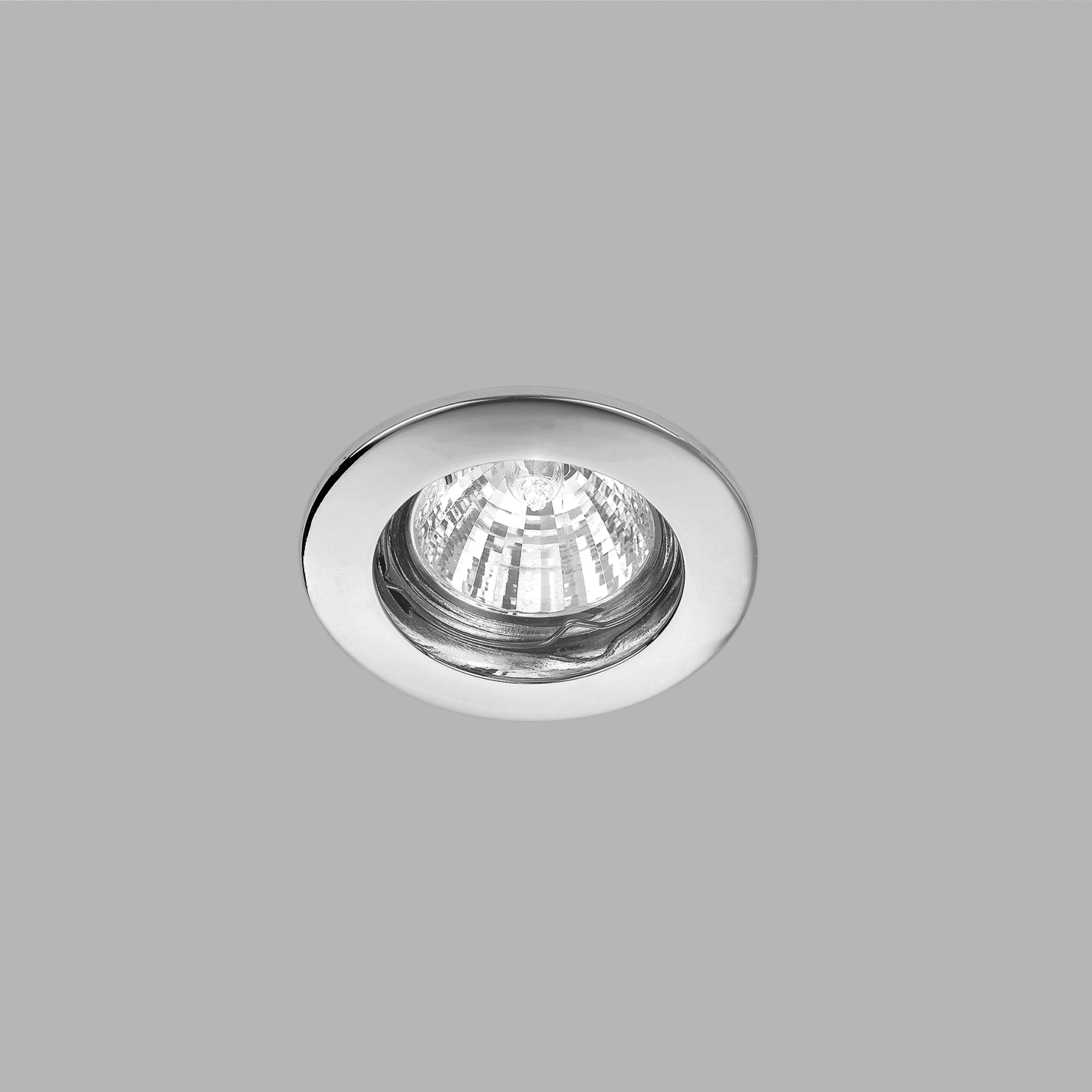 Incasso fisso tondo da interno. Finitura in metallo. Colori disponibili: bianco, oro, cromato o nichel satinato. Completo di portalampada GU10, compatibile con lampada LED max 8W, non inclusa. Diametro 80mm, altezza 25mm. IP20