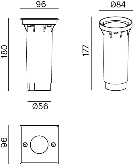 Corpo in pressofusione alluminio anodizzato nero. Controcassa in policarbonato inclusa. Vetro trasparente temperato spessore 12mm. Cavo in neoprene H05RN-F 3x1mm2 di 3m. Alimentazione 220-240V. Versione incasso con doppio ingresso per cablaggio in successione.