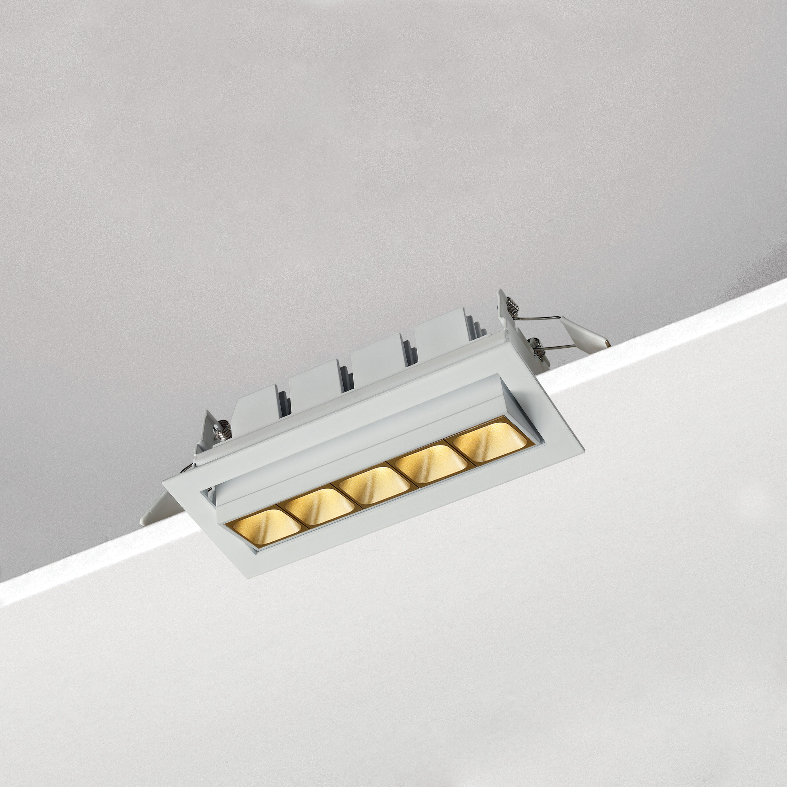 Incasso modulare LED per installazione a soffitto. Moduli 1/2/3/4/5/10 LED. Versione fissa, orientabile e wallwasher. LED OSRAM CRI>90 Lifetime >50.000h (L70B10). Corpo in alluminio, cornice bianca o nera. Riflettori in policarbonato in 4 finiture diverse. Versione wallwasher disponibile solo con finitura argento