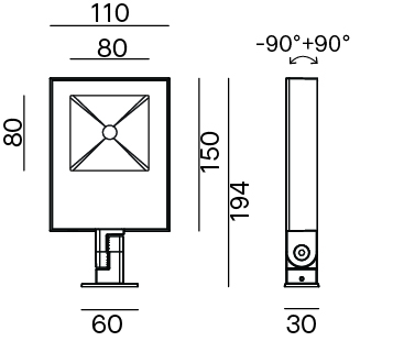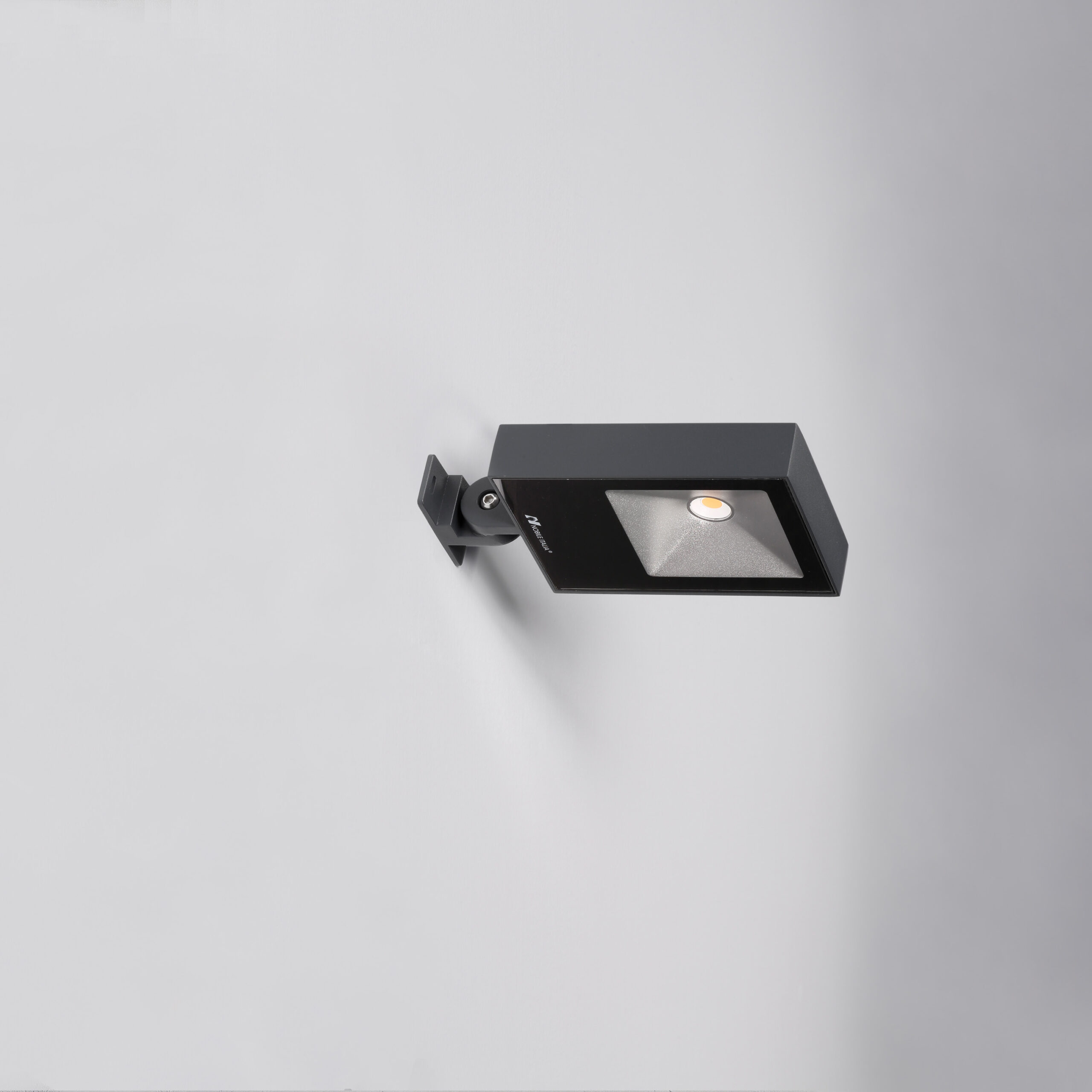 Proiettore LED IP67 per installazione a parete. LED SAMSUNG G3. Lifetime 50.000h (rendimento 70%). Corpo in pressofusione di alluminio verniciato bianco, antracite, grigio o marrone scuro. Diffusore in vetro serigrafato nero. Riflettore in alluminio stampato. Cavo in neoprene H05RN-F 3×0.75mm2 di 1.5m. Alimentatore integrato.