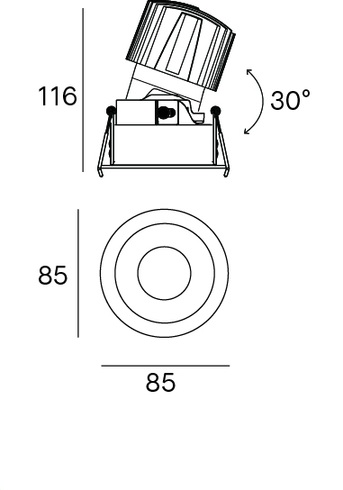 Corpo in alluminio pressofuso. Cornice in alluminio verniciato bianco o nero, o cornice trimless per controsoffitti in cartongesso. Riflettore in policarbonato