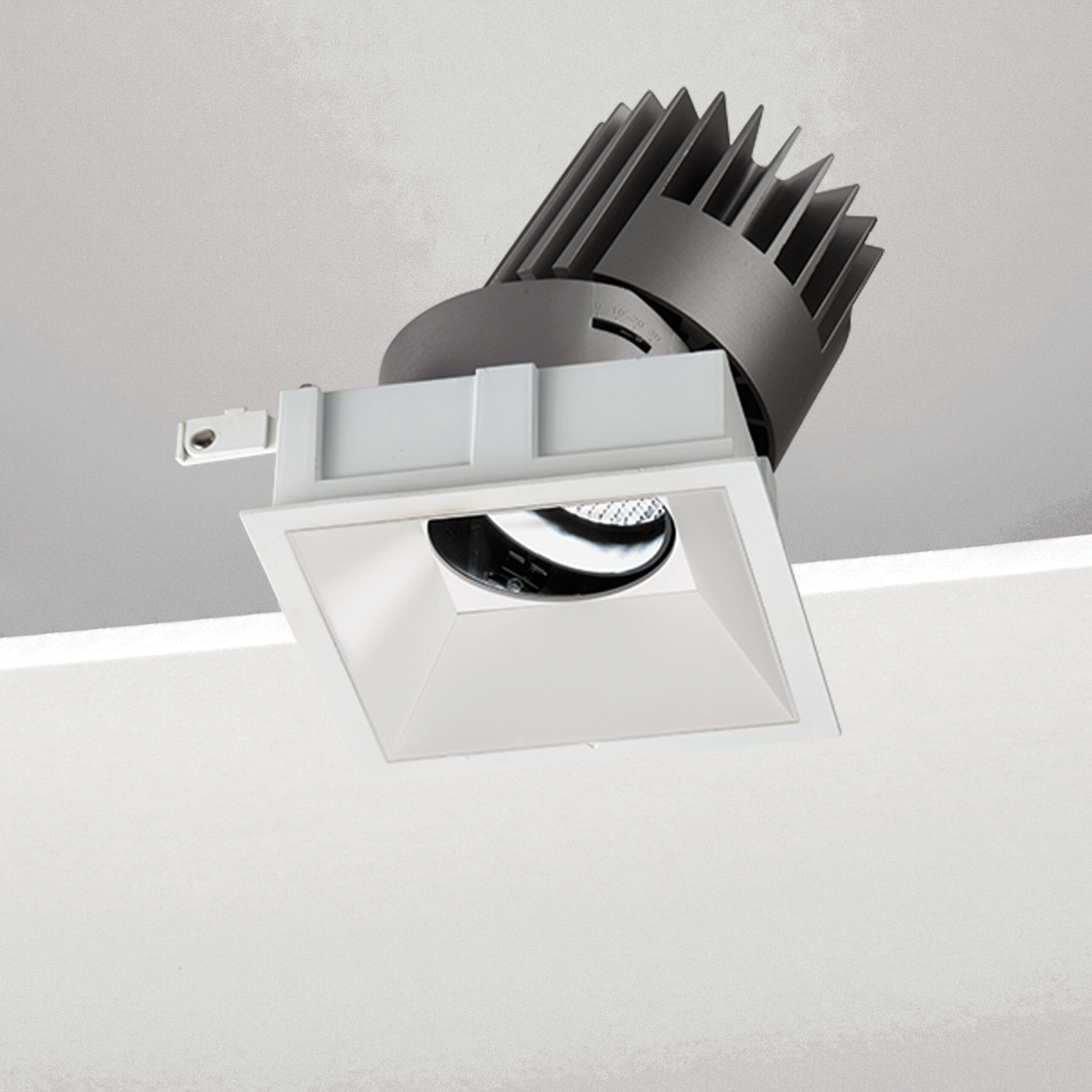 Incasso LED fisso o orientabile, tondo o quadrato, in n.5 misure, per installazione a soffitto. MM: LED COB CREE CRI>90. M0-M1-M2-M3: LED COB CITIZEN CRI>90 (range potenza: 4W-38W). Lifetime >50.000h (L70B10). Corpo in alluminio pressofuso. Modulo LED IP54 (M0-M1-M2-M3). Cornice in alluminio verniciato bianco con staffe di fissaggio regolabili. Riflettori in policarbonato disponibili in diverse finiture. Alimentatore incluso. Disponibili versioni dimmerabili e controllo remoto.