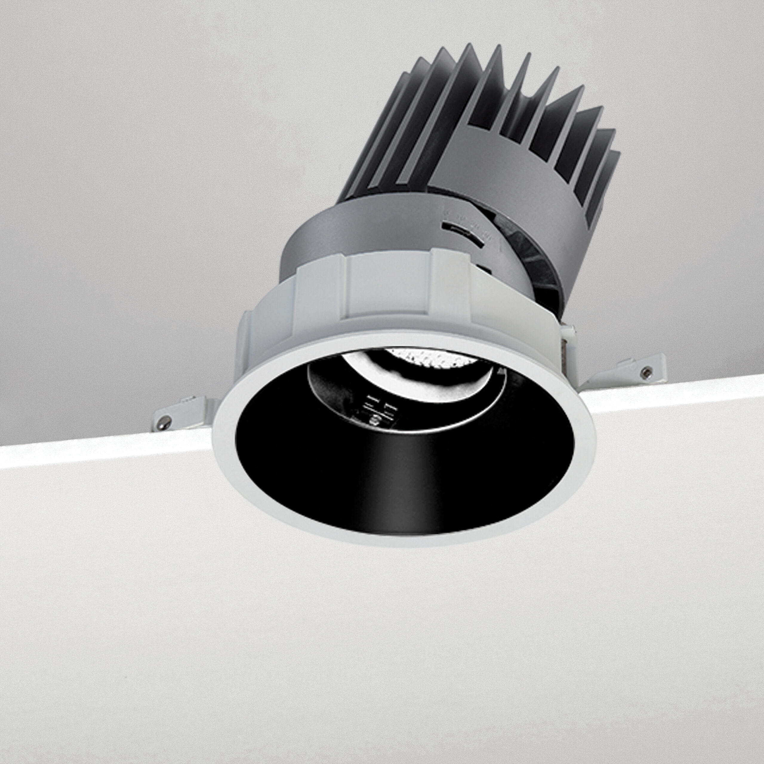 Incasso LED fisso o orientabile, tondo o quadrato, in n.5 misure, per installazione a soffitto. MM: LED COB CREE CRI>90. M0-M1-M2-M3: LED COB CITIZEN CRI>90 (range potenza: 4W-38W). Lifetime >50.000h (L70B10). Corpo in alluminio pressofuso. Modulo LED IP54 (M0-M1-M2-M3). Cornice in alluminio verniciato bianco con staffe di fissaggio regolabili. Riflettori in policarbonato disponibili in diverse finiture. Alimentatore incluso. Disponibili versioni dimmerabili e controllo remoto.