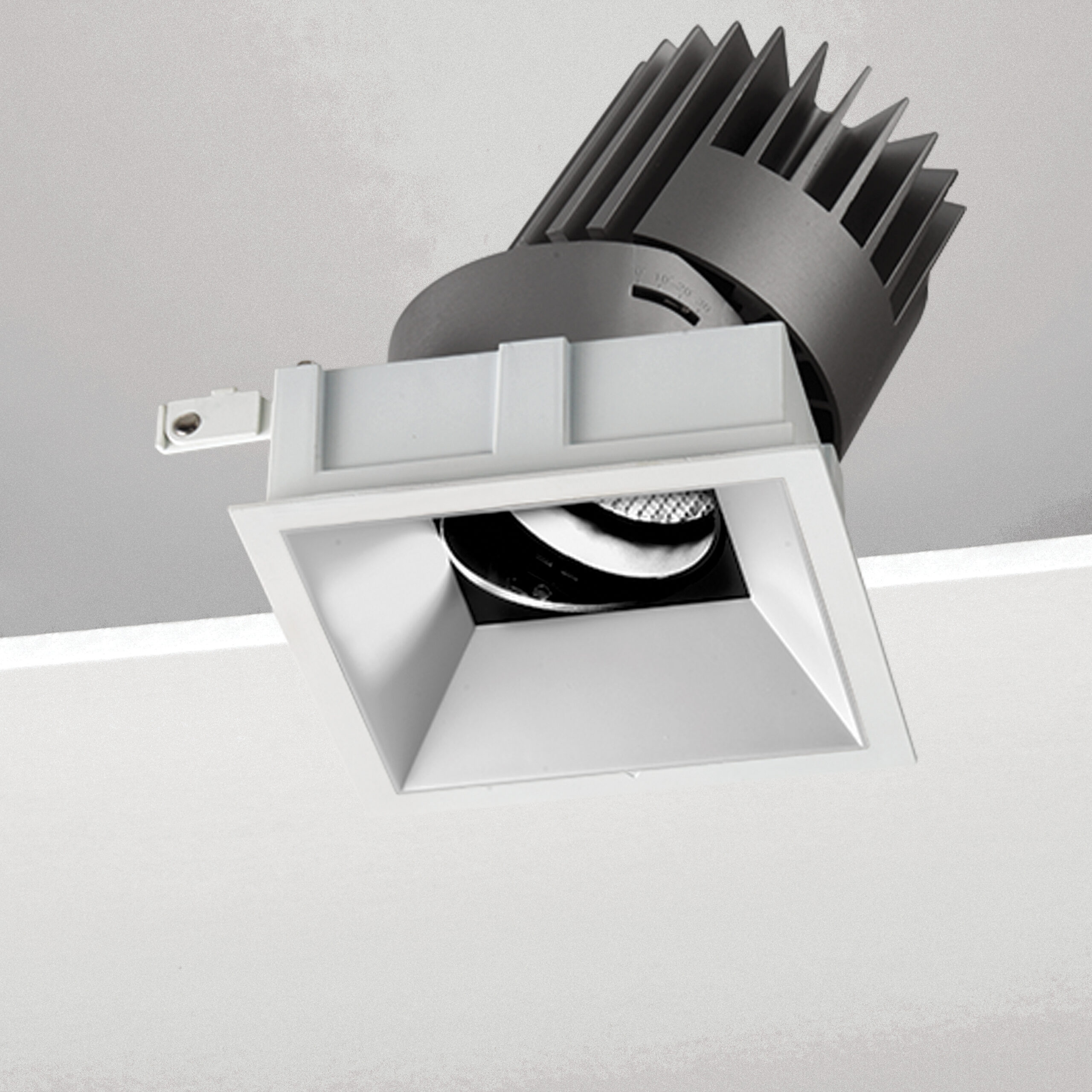 Incasso LED fisso o orientabile, tondo o quadrato, in n.5 misure, per installazione a soffitto. MM: LED COB CREE CRI>90. M0-M1-M2-M3: LED COB CITIZEN CRI>90 (range potenza: 4W-38W). Lifetime >50.000h (L70B10). Corpo in alluminio pressofuso. Modulo LED IP54 (M0-M1-M2-M3). Cornice in alluminio verniciato bianco con staffe di fissaggio regolabili. Riflettori in policarbonato disponibili in diverse finiture. Alimentatore incluso. Disponibili versioni dimmerabili e controllo remoto.