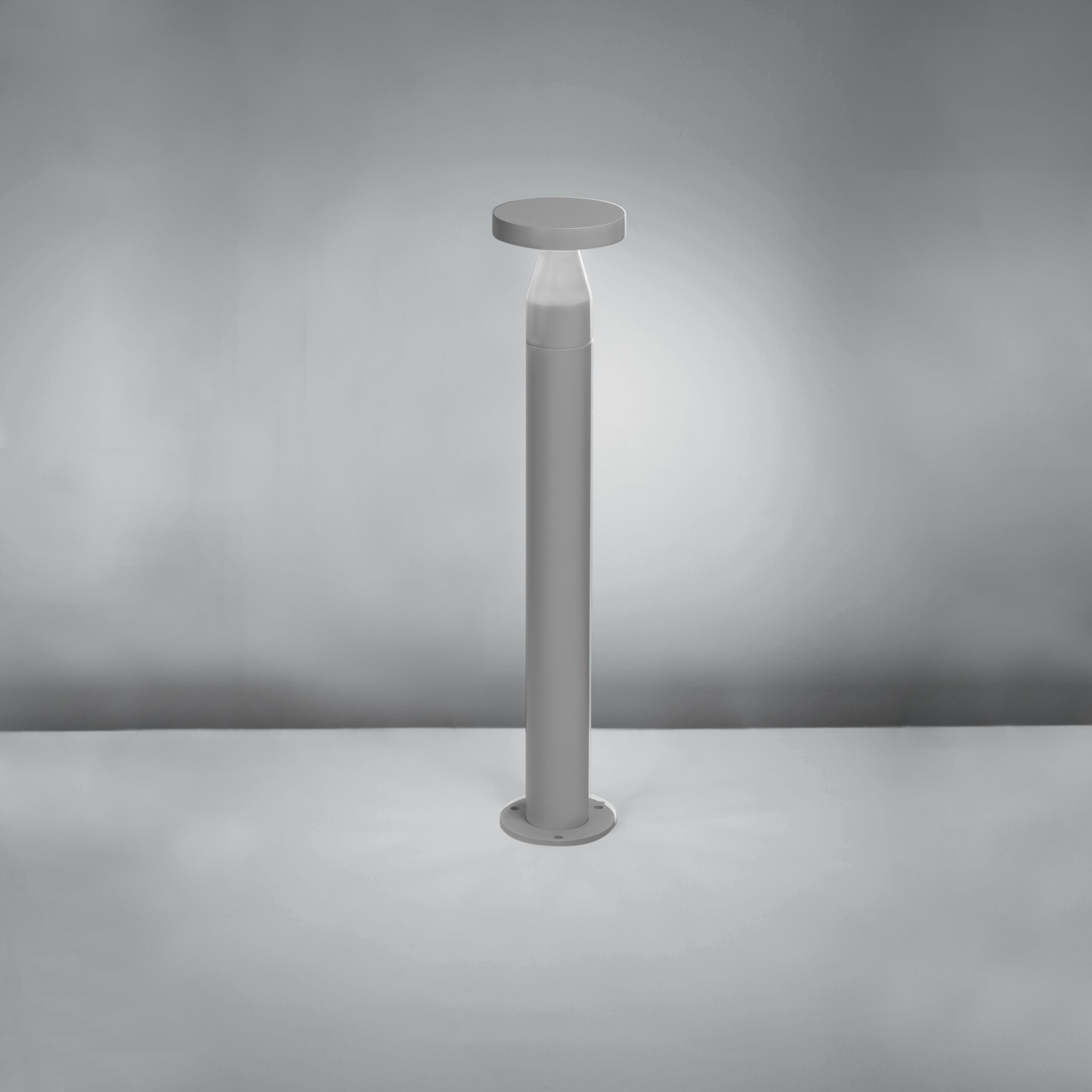 Bollard LED per installazione a pavimento. LED OSRAM. Lifetime 50.000h (rendimento 70%). Corpo in pressofusione di alluminio vernicato bianco, antracite o grigio. Diffusore in vetro microprismatico. Tiranti per il fissaggio nel terreno inclusi. Alimentatore integrato.