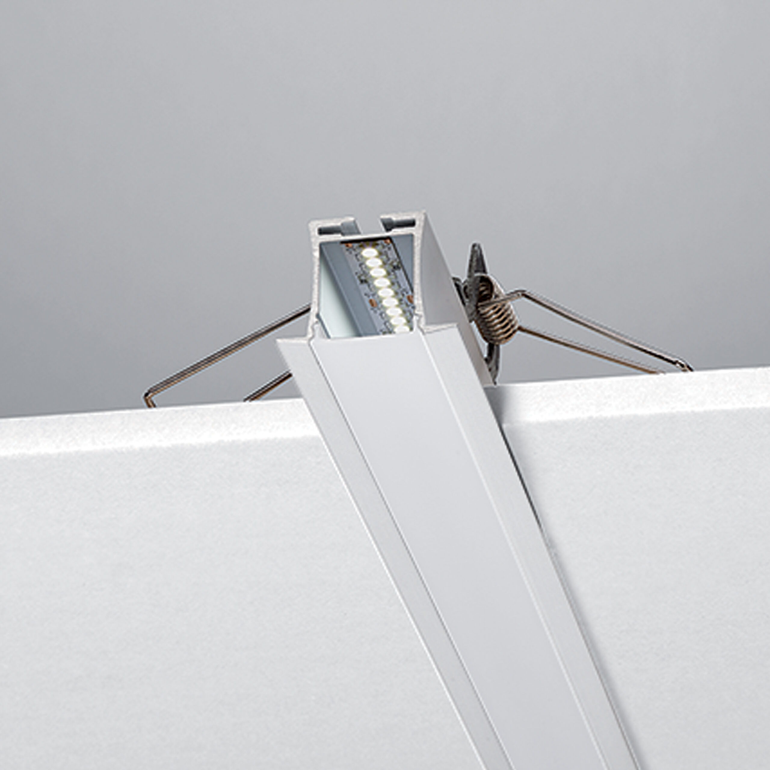 Profilo in alluminio bianco da incasso per striscia LED con diffusore trasparente o opale di 2m. Tappi (4 pz) inclusi. Completo di molle in acciaio (4 pz).