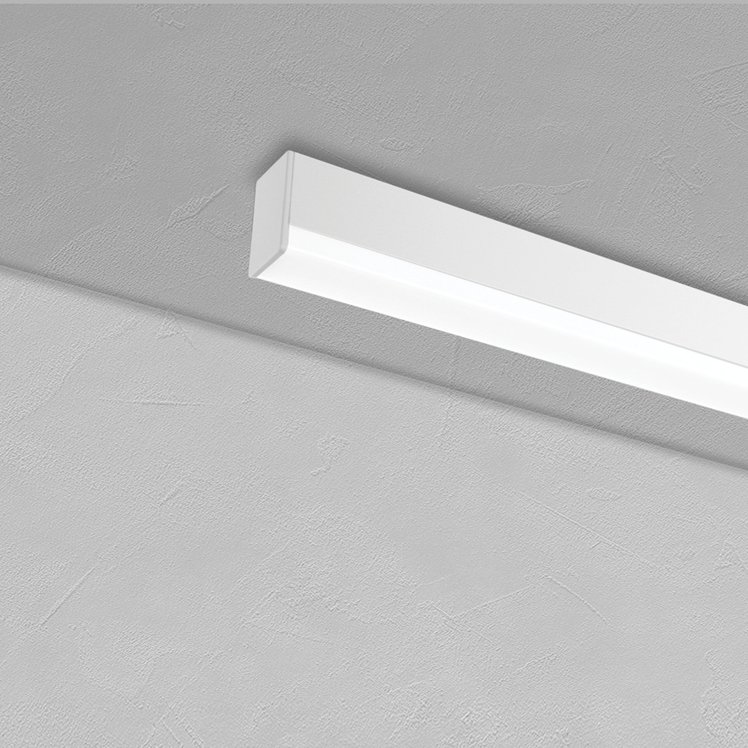 Profilo in alluminio da superficie per striscia LED con diffusore opale di 2m. Tappi (4 pz.) e clips di fissaggio (4 pz.) inclusi. Diffusore sporgente. Alluminio verniciato bianco. Disponibile Kit sospensione e a incasso da ordinare separatamente.