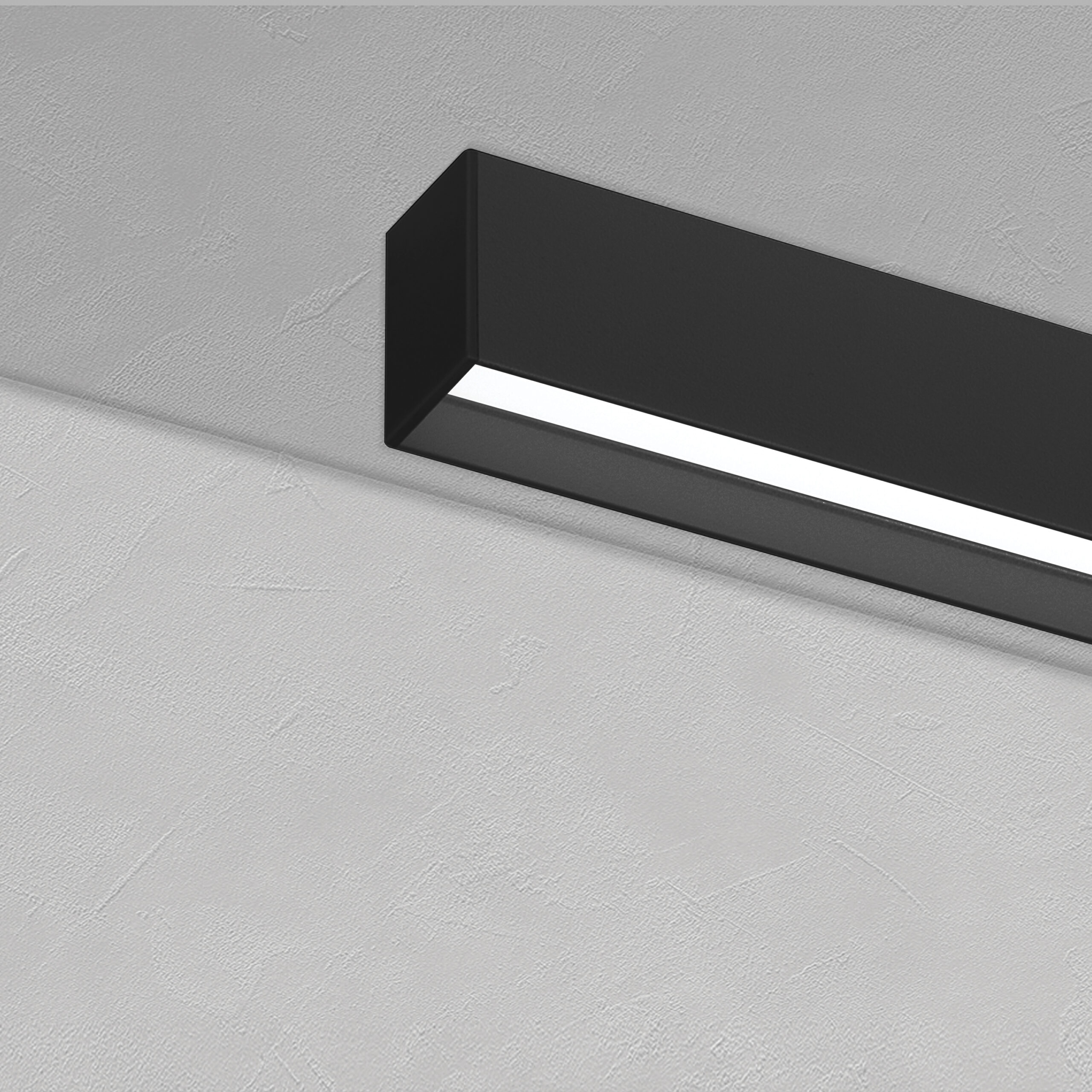 Profilo in alluminio lineare per striscia LED con diffusore arretrato, lunghezza 2m o 3m. Installazione a superficie. Possibilità di installazione a sospensione con accessori da ordinare separatamente. Alluminio verniciato bianco o nero. Diffusore in PC opale. Accessori inclusi: Kit tappi e clip di fissaggio (2 corte e 2 lunghe) e nastro nero (2pz) per evitare il filtraggio di luce.