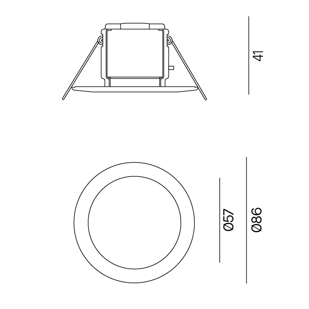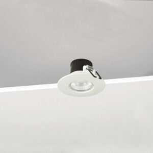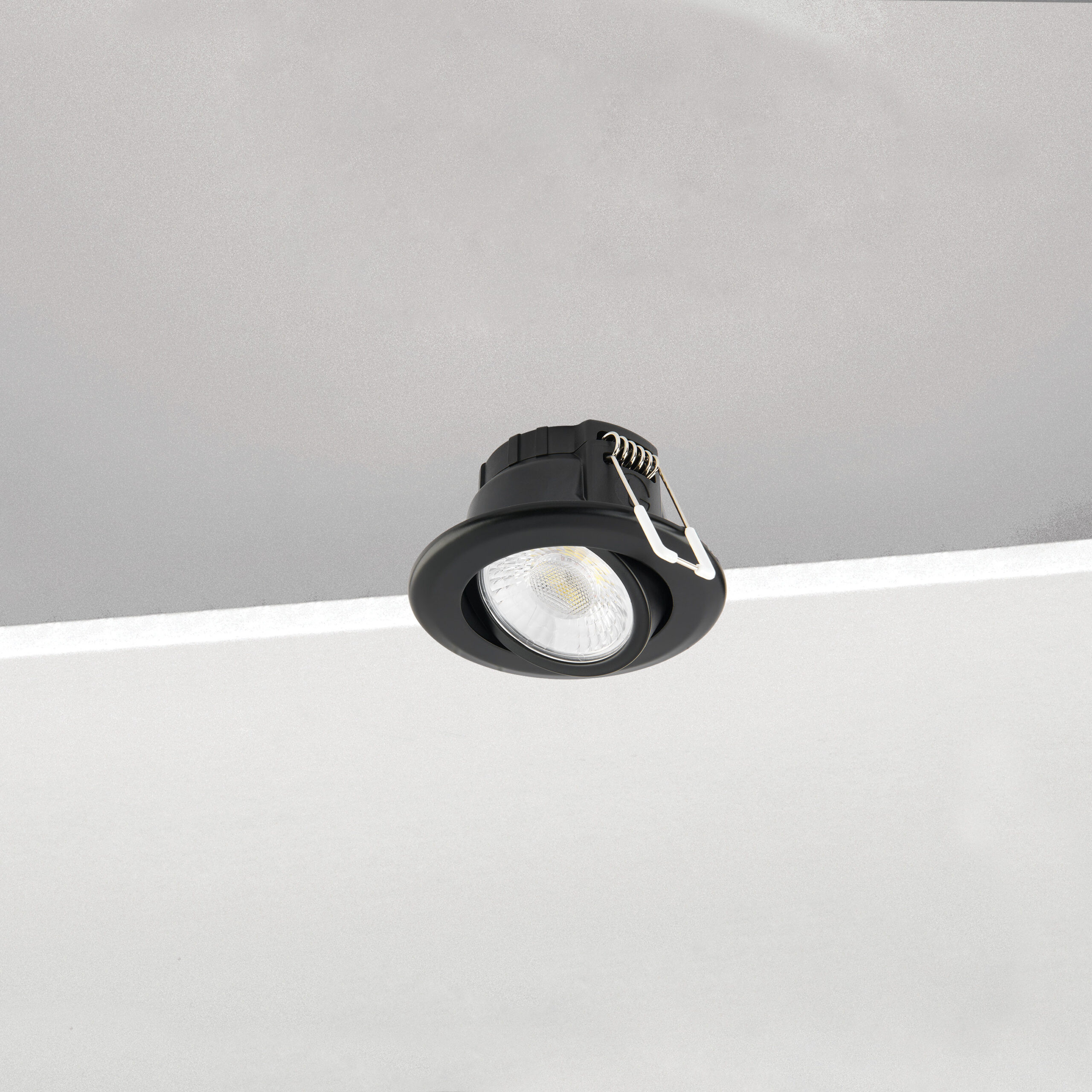 Apparecchio LED tondo ad incasso con ottica orientabile. Massima inclinazione 25°. Cornice in alluminio verniciato bianco, nero o acciaio spazzolato. Corpo in materiale plastico nero. Alimentatore incluso dotato di selettore per cambio temperatura di colore (2700K, 3000K, 4000K) e selettore per cambio potenza (4.5W o 6W). Dimmerabile TRIAC.