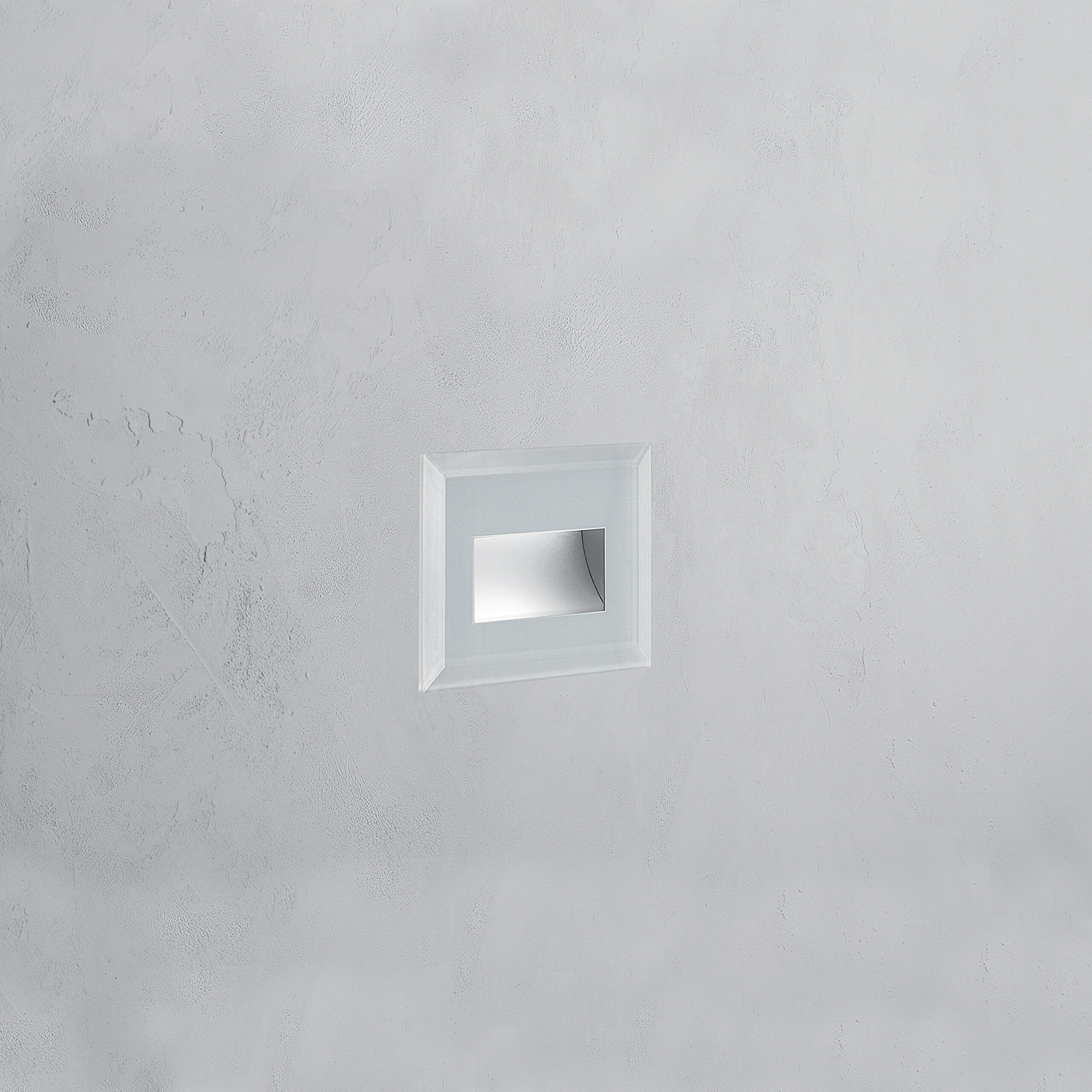 Incasso a LED per installazione a parete. LED OSRAM. Lifetime 50.000h (rendimento 70%). Corpo in alluminio bianco. Diffusore in vetro satinato temperato e serigrafato grigio. Cavo in neoprene H05RN-F 3x1mm2 di 0,5m. Controcassa in acciaio inclusa. Compatibile con scatola 503 (solo per mercato italiano). Alimentatore incluso.