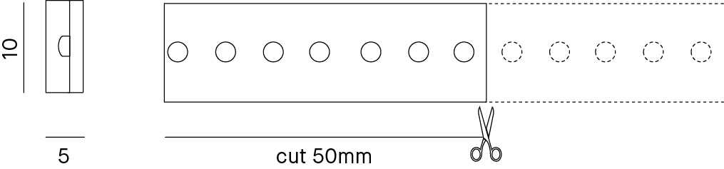 5m, lunghezza massima alimentabile per singola bobina: 5m. Kit tappi di chiusura IP e 10 clip con viti, incluso nella confezione, ordinabile separatamente cod. KIT/LS03/TAPPI. Installazione con clips o su profilo in alluminio da ordinare separatamente. Alimentatore e unità di controllo non inclusi.